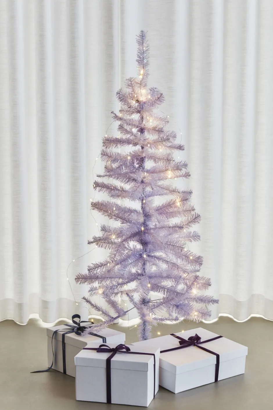 Lavendel farvet juletræ. Der medfølger juletræslyskæde som lyser med et varmt hvidt LED lys, den giver et næsten usynligt look med svævende lys pga. den tynde metaltråd lysene er monteret på. Nem at montere på toppen af træet, inden det evt. pyntes.