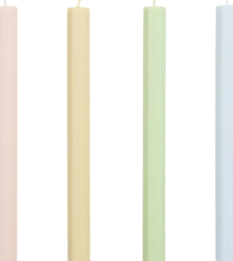 Disse farverige stearinlys har en elegant sekskantet form og en mat finish. De er designet til at fungere lige godt i en gruppe eller stå individuelt. Lysene er Svanemærket certificeret og har en brændetid på ca. 7 timer. Hexagon Candles sælges individuelt såvel som i sæt med fire med forskellige mønsterblandinger at vælge imellem.