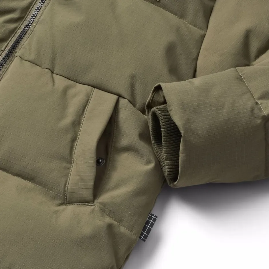Denne armygrønne jakke fra Molo er lavet i genanvendt polyester og har et print af snowboardere i alperne. Jakken har en praktisk lynlåslukning, høj krave, aftagelig hætte, frontlommer, en indvendig lomme, ribkant ved håndleddene og en justerbar elastik i bunden. Bagpå er der en stor refleks.