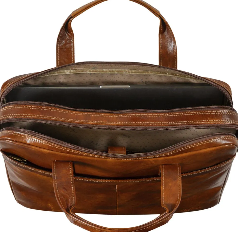 Oplev den elegante briefcase fra Tony Perotti, håndlavet i vegetabilsk garvet læder. Denne briefcase har plads til en 14” laptop, kuglepenne og en tablet. Med en justerbar og aftagelig skulderrem kombinerer den stil med funktionalitet og komfort. Bagpå tasken findes en rem, så du nemt kan transportere den på din kuffert, når du er ude og rejse.