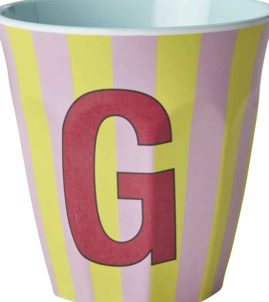 Den skønne melaminkop med bogstaver. Mix og match på kryds og tværs, og skriv lige det budskab, der falder dig ind med de forskellige kopper. Eller gør det enkelt for alle i familien at have deres helt egen personlige kop. Her er bogstavet G. Koppen er en favorit, og det er der god grund til. Brug den til alt muligt – som drikkekrus, til skriveredskaber eller til lækre smoothies. Kun fantasien sætter grænser. Vær opmærksom på, at produkterne ikke er egnet til mikroovn.