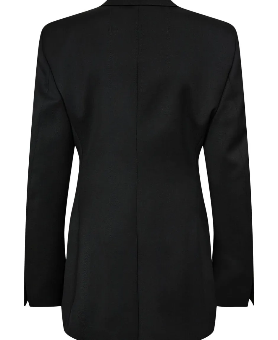 Single ammende blazer. Skræddersyet konstruktion. Monteret på wai st. To knapper foran. Brystlomme. Jettede klaplommer. Knapper ved ærmemanchetter. Vent midt bagpå. Indvendig lomme. Fuldt foret.