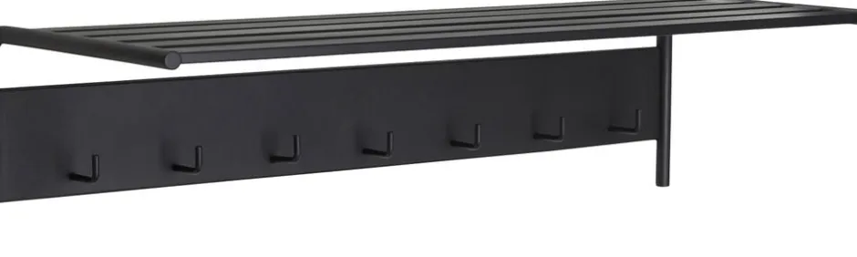 Sort hattehylde med knagerække i pulverlakeret metal.