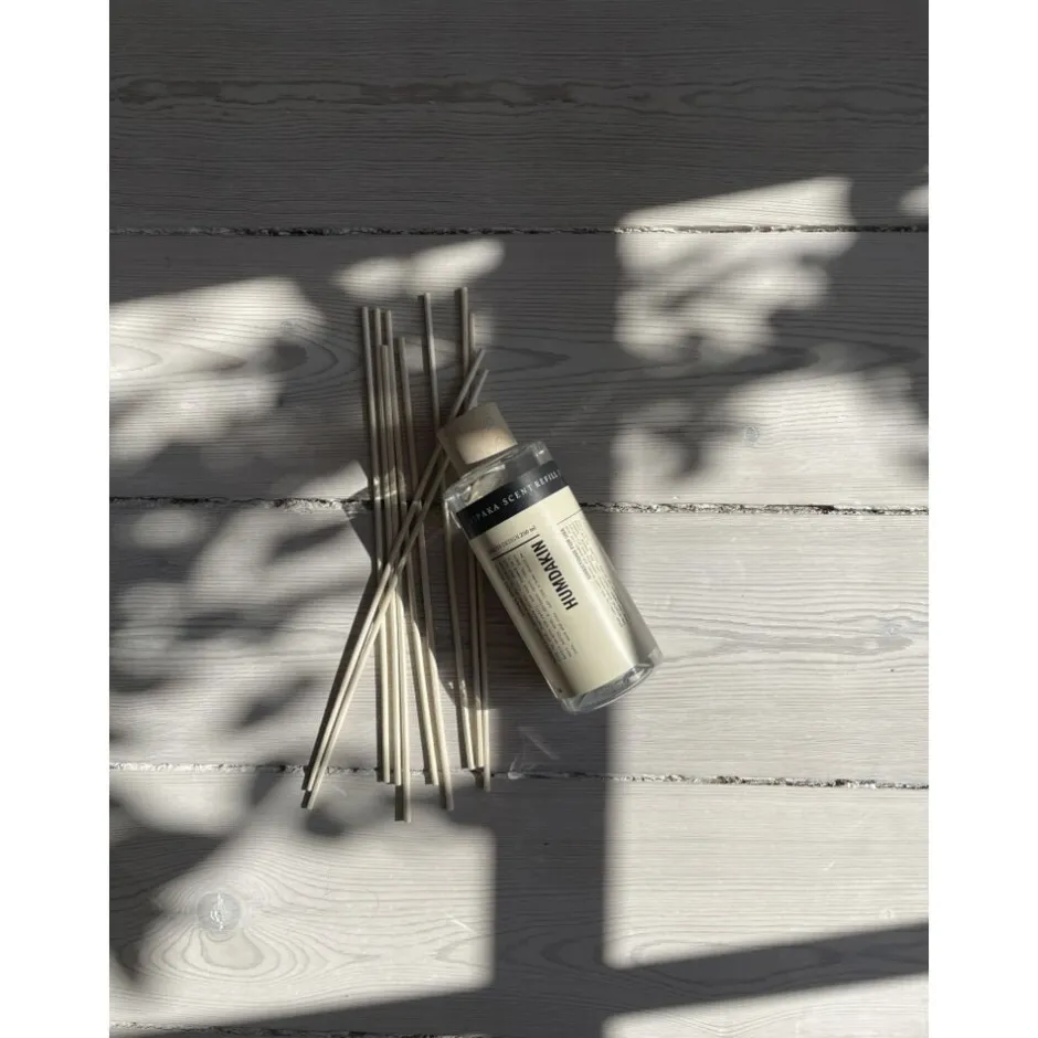 HUMDAKIN REFILL PEARL 250 ml. Humdakin scent refill for Pearl fragrance sticks for the sustainable mindset. With this product you can prolong the life of your original Pearl fragrance sticks with the glass bottle by refilling the oil and sticks. In this product you get a full refill of 250 ml. oil in a reusable PET plastic bottle and 10 new sticks. A sustainable solution for our planet. The Pearl scent combines the fresh yet sweet scent of apple and sandalwood. DIRECTIONS FOR USE- Remove the lid of your original fragrance sticks and poor the new oil in. Replace the old sticks with the new ones. We recommend placing three sticks in the oil, however, you can place more or less depending on how strong you want the scent to be and where in the room the bottle is placed. The bottle is recyclable PET plastic with a wooden lid. Ingredients- Tetramethyl acetyloctahydrophthalenes, ethyl linalool