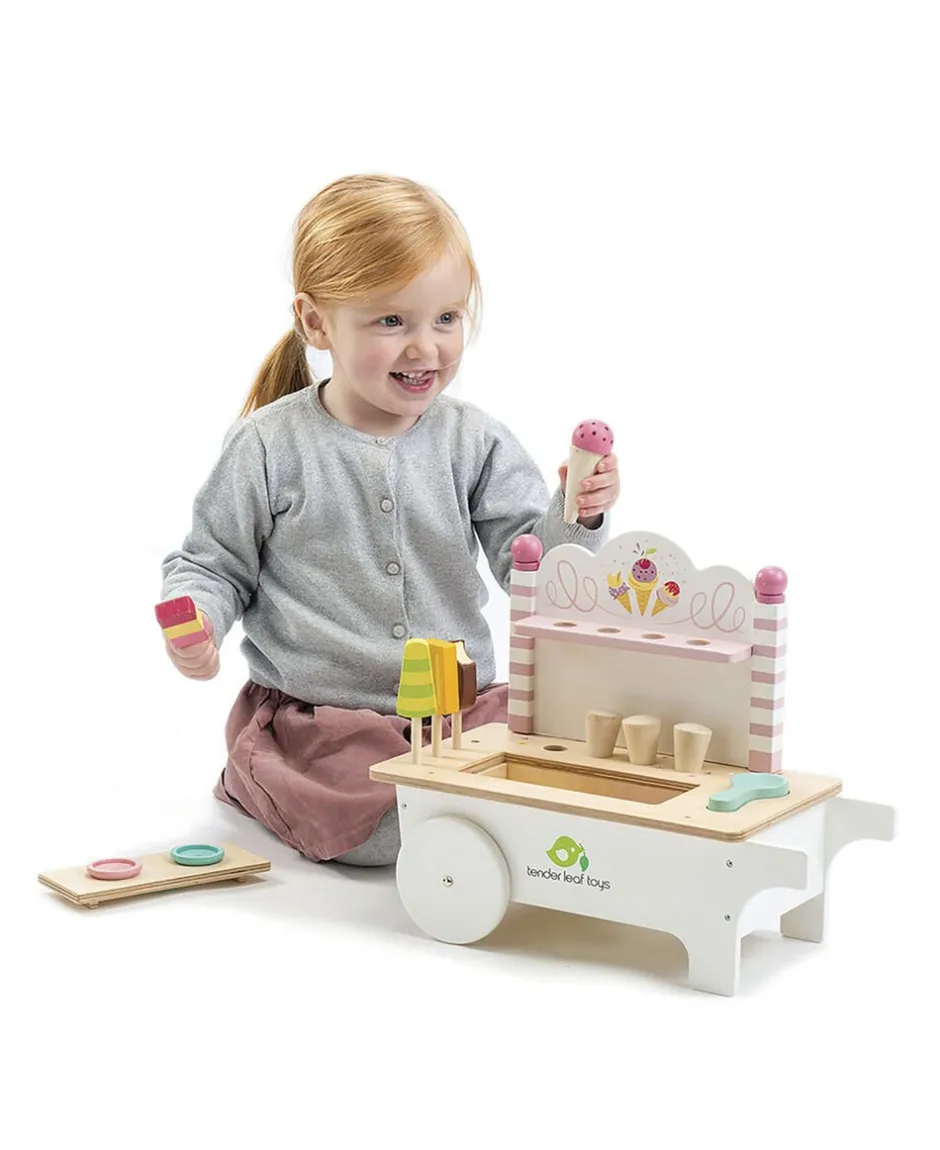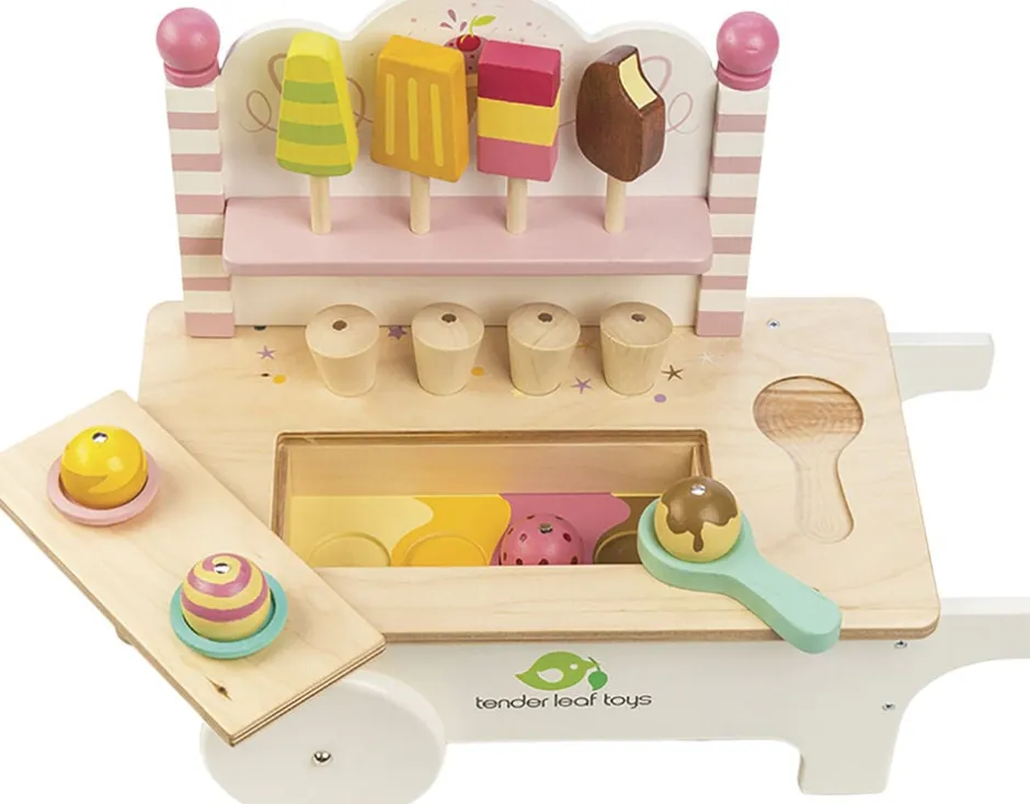 Smuk isvogn med hjul og forskellige slags is.