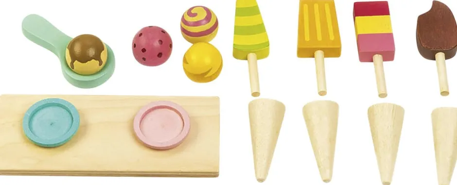 4 ispinde af træ, 4 kræmmerhuse, 4 farverige iskugler med magneter, en magnetisk isske og et aftageligt låg, hvorunder man kan opbevare alle isene.