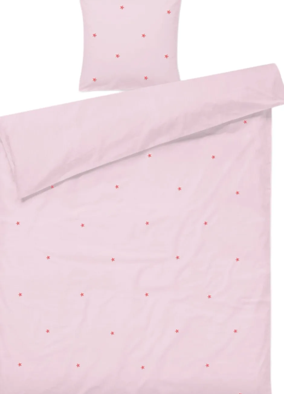 Små blomster til store drømme. Med Daisy-sengesættet fra JUNA får du en nyfortolkning af det klassiske blomsterprint, hvor en broderet blomst i kontrastfarve smukt og stilfuldt spiller sammen med JUNAs altid både enkle og moderne design. Sanseligt, behageligt og produceret ud fra ansvarlige principper. Sådan kender du sengetøjet fra JUNA. Og med Daisy-serien fortsætter JUNA i samme både vidunderlige og ansvarlige stil, hvor uendelige drømme lever og ånder side om side med en passioneret vision for ansvarlighed og cirkularitet nu og i fremtiden. Sengetøjet til almindelige dyner måler 140×200 cm, og i denne livlige lyserøde version med små broderede blomster i rød får du en modig og legende farvevariant med masser af hygge og varme. Daisy er fremstillet i 100% økologisk bomuld, der både er GOTS-certificeret og OEKO-TEX®-mærket, så du kan nyde en god nats søvn med god samvittighed. Og når du kommer helt tæt på Daisy-sengetøjet, vil du ud over detaljerne med de mange små margueritter også virkelig kunne se og mærke lækkerheden i den tætte og fine bomuldspercale, der giver stoffet en blød og glat tekstur. Samtidig med at være ekstrem behagelig at sove i får du med percalevævningen også et meget slidstærkt og holdbart sengesæt i en eksklusiv kvalitet, som du kan have glæde af nat efter nat og år efter år. Daisy-seriens hyggelige og klassiske vibe med et moderne tvist skaber en glad og drømmende stemning i soveværelset, i sofaen, i hængekøjen, på altanen, eller hvor du nu tager din dyne og pude med hen. Det er helt op til dig, og med de forskellige Daisy-sengesæt fra JUNA kan du jo sagtens mixe og matche farver på dyner og puder på kryds og tværs og skabe din helt egen stil. (GOTS Organic Certified by Control Union, CU1026087)