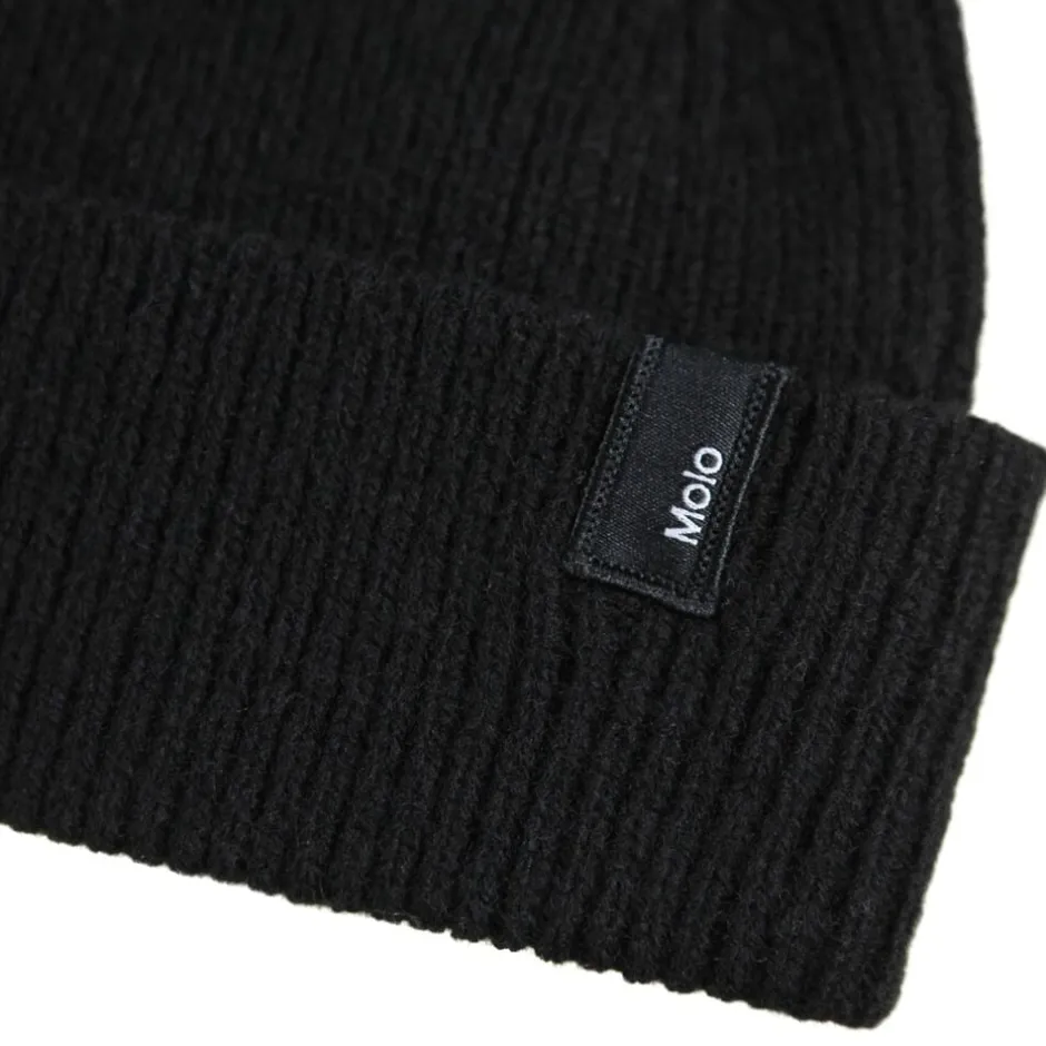 Sort ribstrikket hue i uld fra Molo med ombuk og Molos logo.