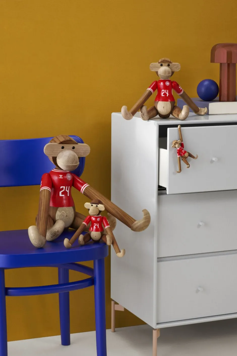 Ny holdkammerat til alle i rødt og hvidt. Med Kay Bojesen Abe x DBU er to af de største danske nationalikoner gået sammen for med humor, kreativitet og det gode håndværk at hylde sammenholdet og stoltheden over at stå sammen side om side fra leg til landshold. Og ligesom fodboldens verden byder på rækker og ligaer fra miniput til megastjerne, så kan du selvfølgelig også få Kay Bojesen Abe x DBU i den størrelse, der lige præcis passer ind i dit fanbarometer. Den mindste hedder Kay Bojesen Abe x DBU mini og udmærker sig med sine 9,5 cm i højden ved at være den mest bærbare minifan, som du kan have med dig overalt. Du bestemmer selv, om det skal være denne model med herrelandsholdets spillertrøje eller udgaven med kvindernes landsholdstrøje, som du inviterer indenfor eller måske dem begge. Du kan nemlig få Kay Bojesen Abe x DBU i to unikke varianter iklædt enten herrelandsholdets eller kvindelandsholdets flotte påmalede hjemmebanetrøjer, der begge er fortolket i tråd med figurhistorien og Kay Bojesens DNA helt ned til den mindste detalje, så de to trøjedesigns står så tæt som muligt på originalen og alligevel med deres helt eget tvist. Alle størrelser og varianter kommer i det klassiske teak og kontrolleret limbatræ. Samarbejdet med DBU sætter Kay Bojesens originale fortællinger i træ i en ny kontekst og tilføjer ydmygt og med et glimt i øjet et funklende nyt kapitel til en i forvejen smilende og levende designarv.