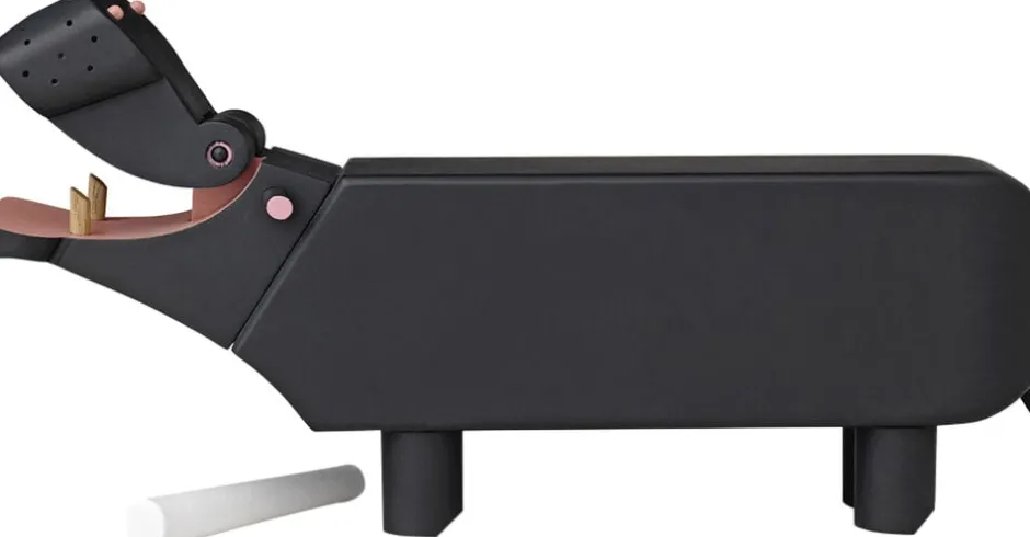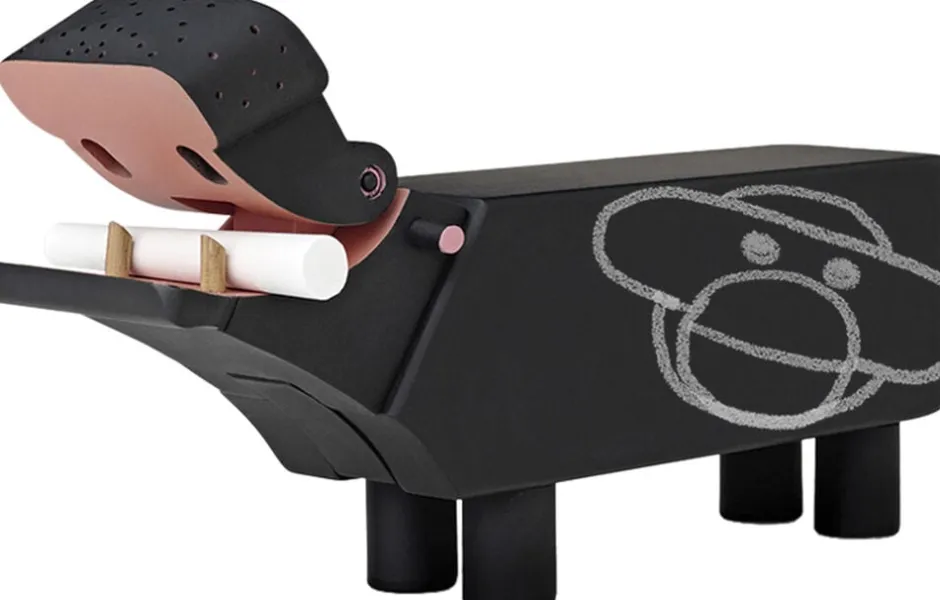 Flodhesten er lavet af bøg og belagt med sort tavlemaling. Flodhesten er ca. 2 cm højere og bredere end den nuværende i sortimentet, hvilket gør den let at tegne og skrive på. Det hvide tavlekridt medfølger i æsken.