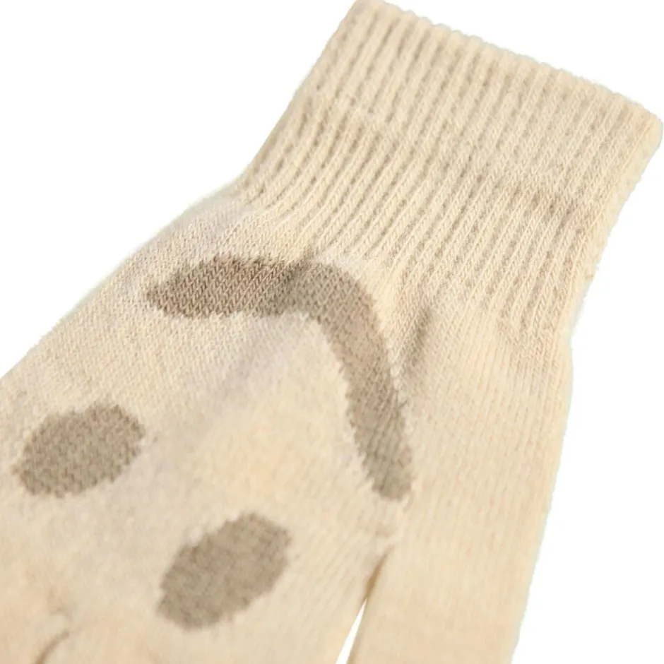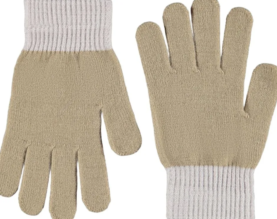 2-pak strikhandsker fra Molo i creme og rød. Det ene par er grå og sort, det andet par er sort med et gråt smilende ansigt.