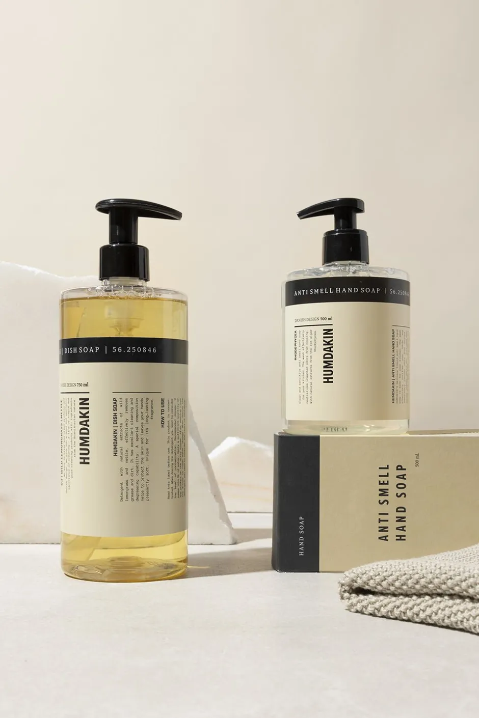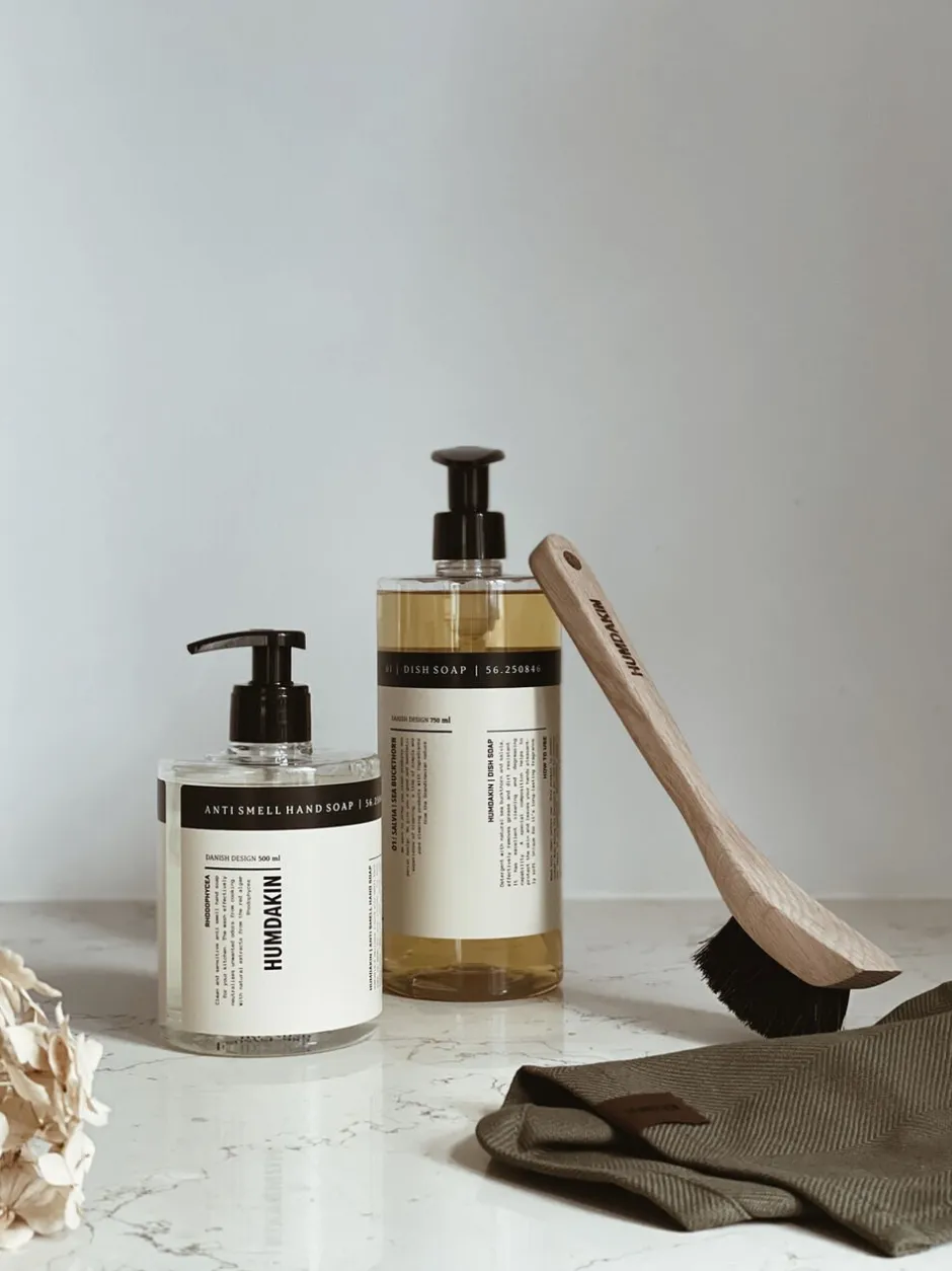 KITCHEN KIT 750 ml 01 Dish Soap + 500 ml Anti Smell Hand Soap PET recyclable plastic Packed in box In this kit, you get exactly what you need for an effective environment to your kitchen- 750 ml 01 dish soap and 500 ml anti smell hand soap. The 01 dish soap is a liquid detergent that effectively removes grease and food residue. The Humdakin dish soap is both effective, fragrant and decorative in your kitchen – perfect for daily kitchen cleaning and styling. The Anti Smell hand soap is a nurturing hand soap with a lovely fragrance, that efficiently cleans your hands and immediately removes odors from seafood, onions, cheese, garlic etc. The perfect set for a clean kitchen and for clean and fresh hands! Ingredients 01 dish soap- Between (no less than) 5% and (no more than) 15% anionic surfactants, less than 5% amphoteric surfactants, preservations agents (2-phenoxyethanol) and perfumes. Ingredients anti smell hand soap- Aqua, Sodium Laureth Sulfate, Cocamide DEA, Sodium Chloride, Cocamidopropyl Betaine, Glycerin, Parfum, Citronellyl Methylcrotonate, Polyquaternium-7, Lactic Acid, Hydrolyzed Rhodophycea