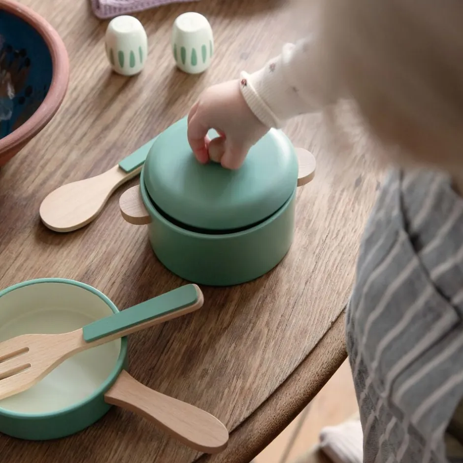 Det fine trækøkkensæt består af gryde med låg, pande, grydeske, paletkniv samt salt & pebersæt. Sættet er fremstillet af certificeret træ og en del af Sebras køkkenunivers, der også indeholder køkkenredskabssæt, spisesæt og tesæt. Alle delene passer desuden til KiDchen-legekøkkenet, der består af tre moduler.