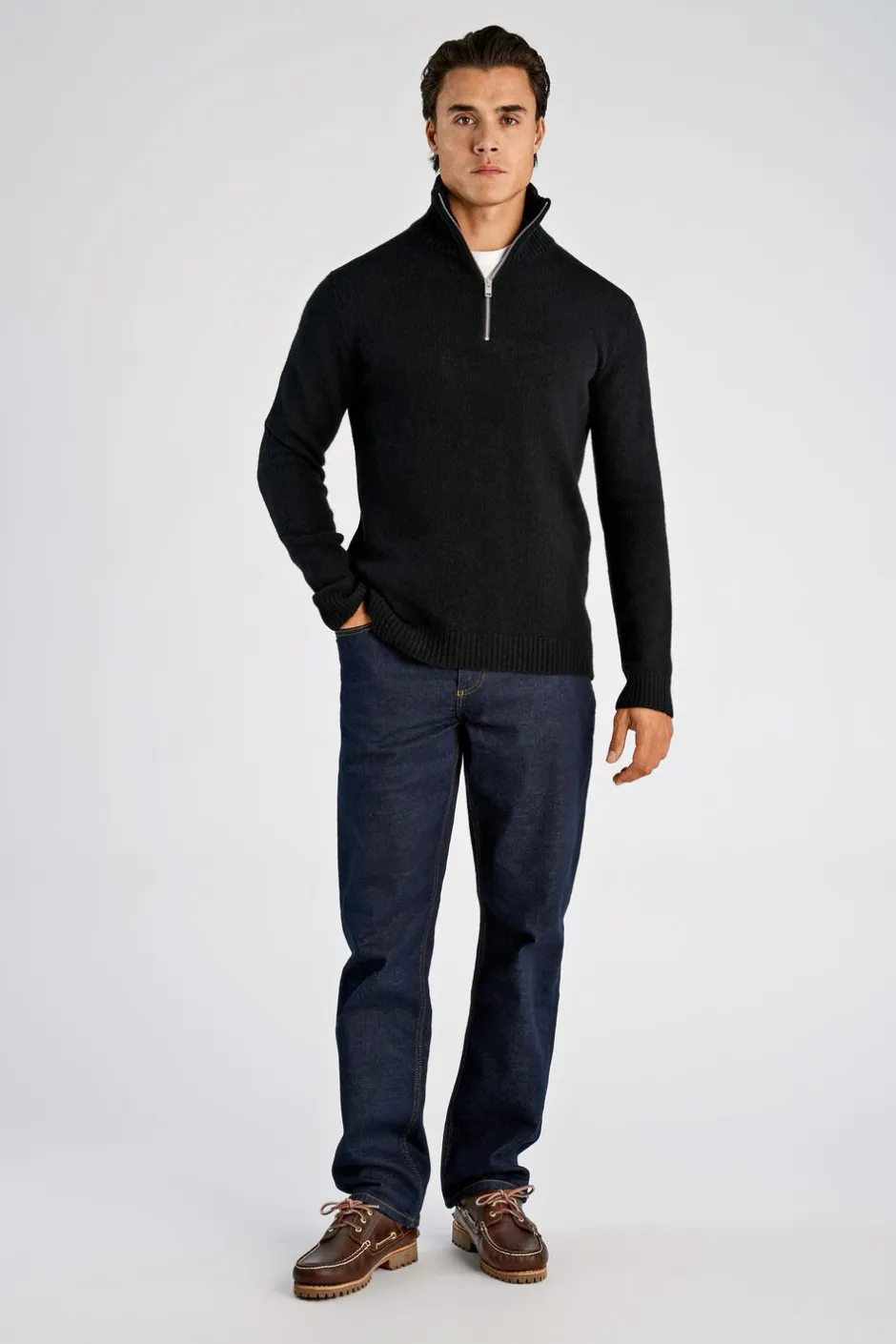 Moderne striktrøje lavet med 80% lammeuld, som gør den varm og blød og samtidig er både åndbart og isolerende. Ensfarvet og med ribstrik nederst på trøjen samt på ærmerne og på kraven. Lavet i relaxed fit, som er tætsiddende uden at være stram.