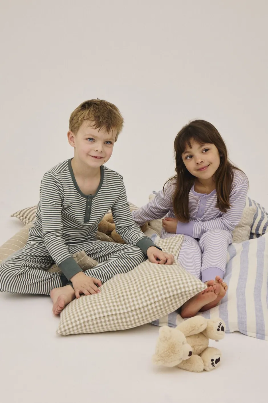 Pyjamas fra Magasin du Nord Collection i den blødeste kvalitet af 100% økologisk bomuld med GOTS-certificering. Sættet består af en langærmet bluse og et par bukser med et fint, ternet stribet, brede ribkanter samt en smal pasform. Derudover har bukserne en bred elastik i taljen, og blusen har en rund halsudskæring med knaplukning på fronten. En skøn pyjamas i den absolut lækreste kvalitet.