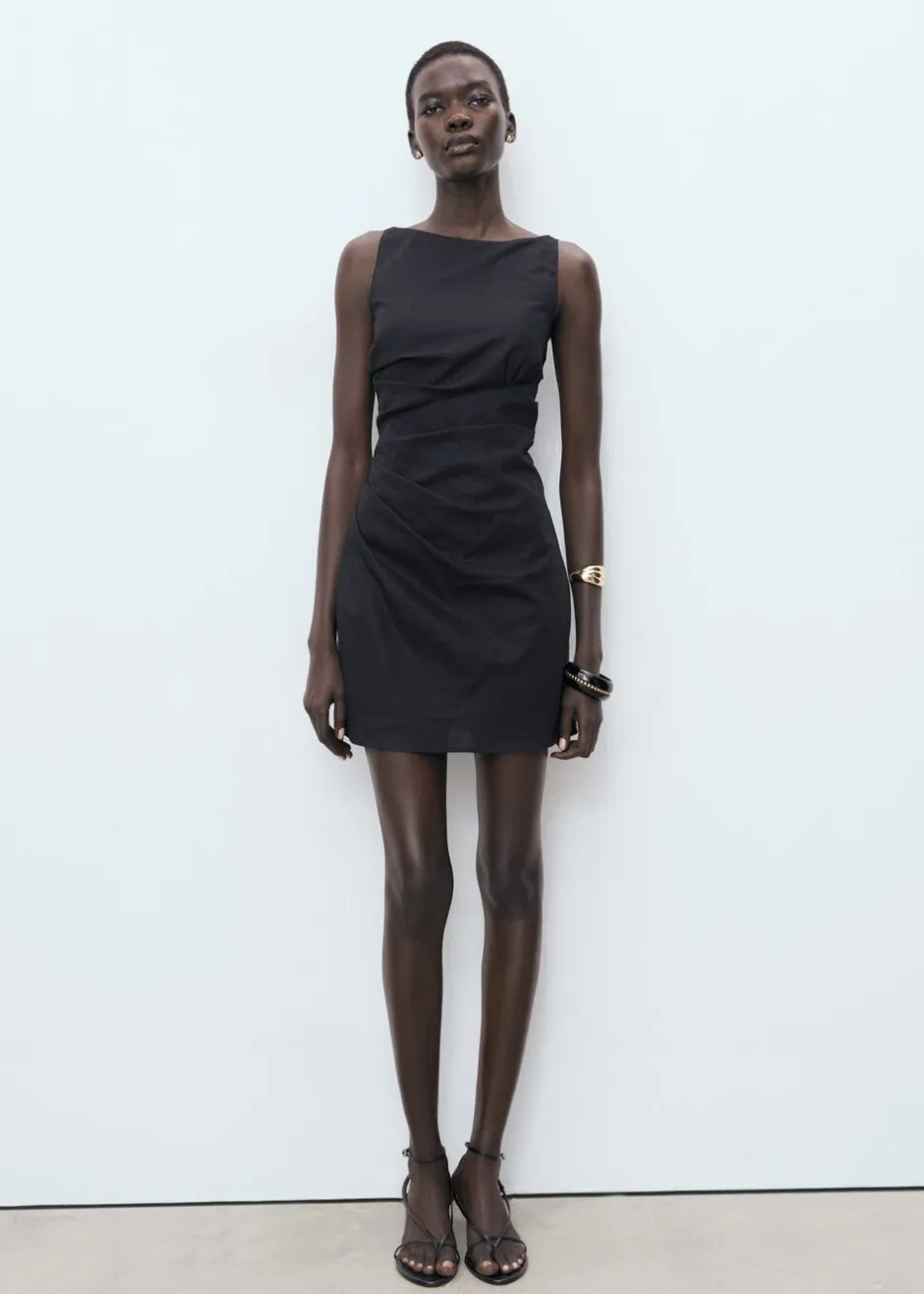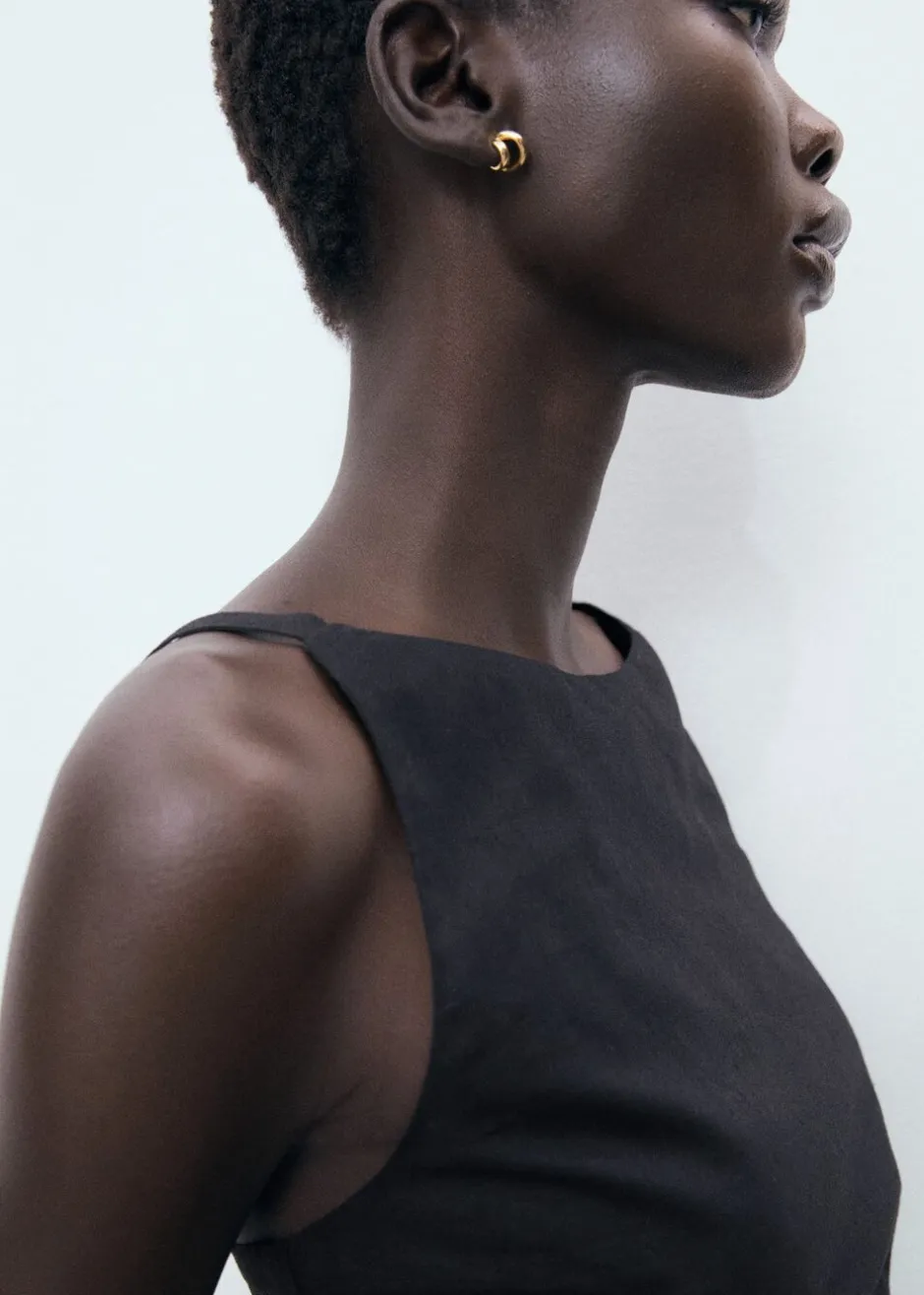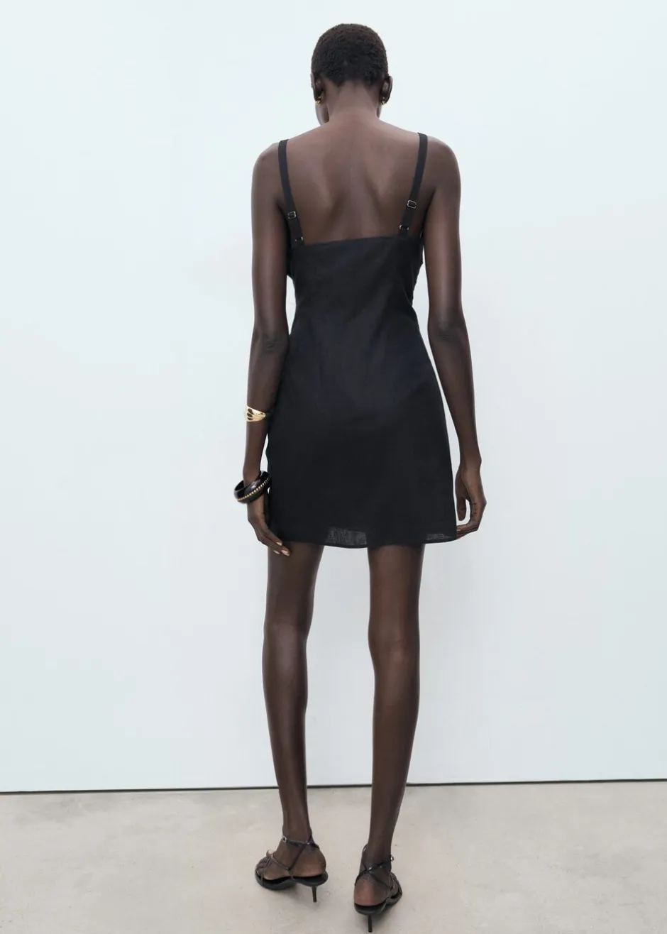 Hør- og bomuldsblanding, kort Design, barbermaskinet Design, bådhals, ærmeløs, tynde justerbare stropper, lynlås i siden, indvendig foring, blå farve er en Exclusive online.