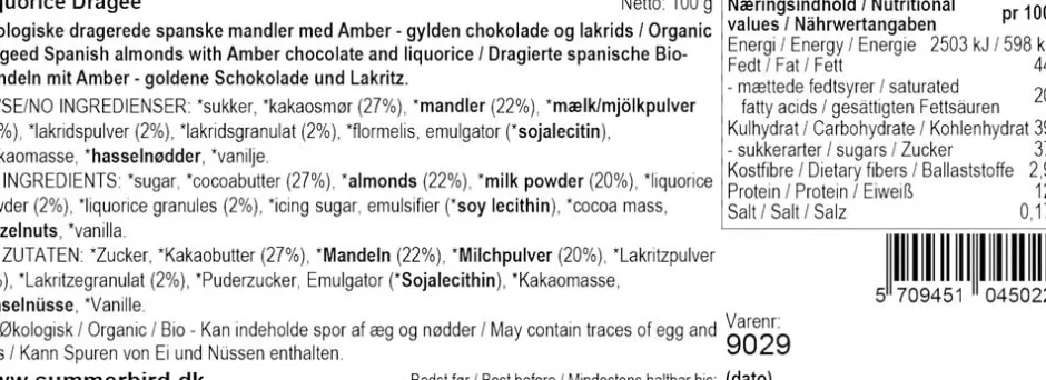 Let ristede økologiske spanske mandler, drageret i Amber Classic-chokolade og granulat af rå lakrids. En mandel med kant fra det italienske lakridspulver, dybde fra den karamelliserede Amber Classic-chokolade og umami fra de sprøde spanske mandler