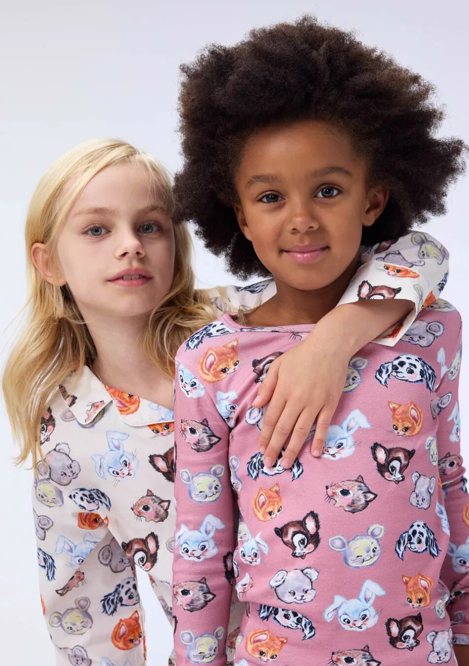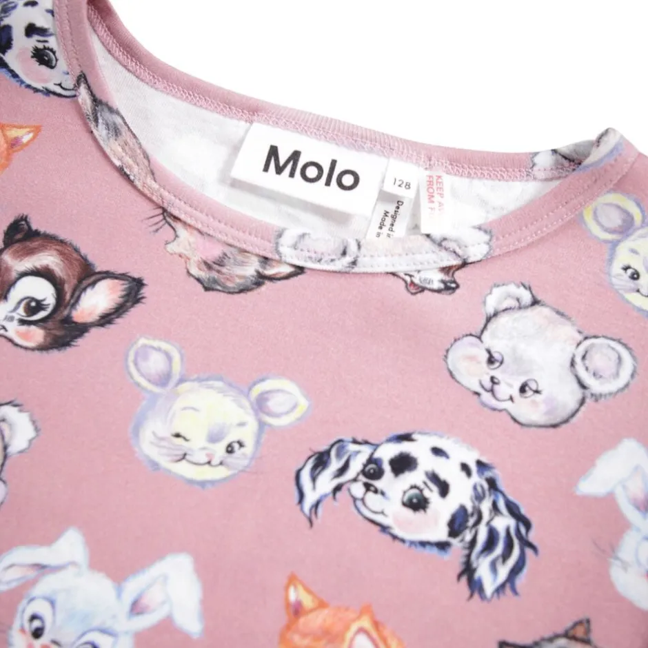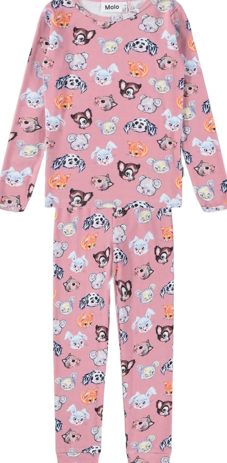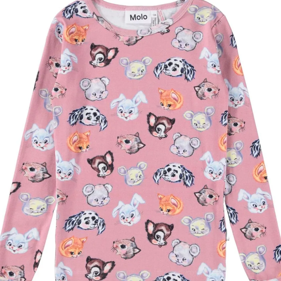 Dette nattøjssæt fra Molo er fremstillet i økologisk bomuld. Bukserne har en elastisk talje og ribkant ved anklerne, mens toppen har en rund halsudskæring og et stort, spraymalet smil i sort som placeret print på fronten.