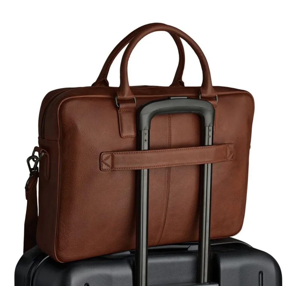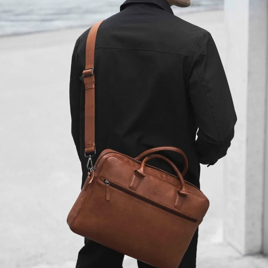 Mason Laptop Bag fra Markberg Man er en tidløs arbejdstaske i 100% blødt kalveskind, med et minimalistisk og eksklusivt udtryk. Tasken er designet med fokus på funktionalitet og enkel elegance perfekt til hverdagen på kontoret eller på farten. Kvaliteten er LWG-certificeret og er en del af vores Zero Waste, hvor intet skind går til spilde i produktionen. Læderets struktur og nuance kan variere naturligt og giver et unikt udtryk. På fronten har tasken en god stor lynlåslomme, med plads til mindre ejendele. Taskens har ét stor hoved rum. Her er der plads til diverse dokumenter og andre ting, du har med på farten. I den ene side er der en åben lomme, samt 2 rum til kuglepinde. Ved den anden side der et polstret rum, der er tiltænkt til din 14 eller 15′ computer. Under den er der en lynlåslomme. Hoved rummet lukkes med lynlås. Bagpå tasken er der en luggage strap i læder, som er fastgjort på tasken. Perfekt til at have på din kuffert, når du er på farten og ude og rejse. Tasken har to gode bærehanke, samt en aftagelig og justerbar skulderrem, så den kan bruges på flere måder. Taskens hardware er i metal, som er belagt og så er det nikkelfri. Taskens slidstærke for er i 100% polyester og så måler tasken 41 cm x 29 cm x 7 cm.