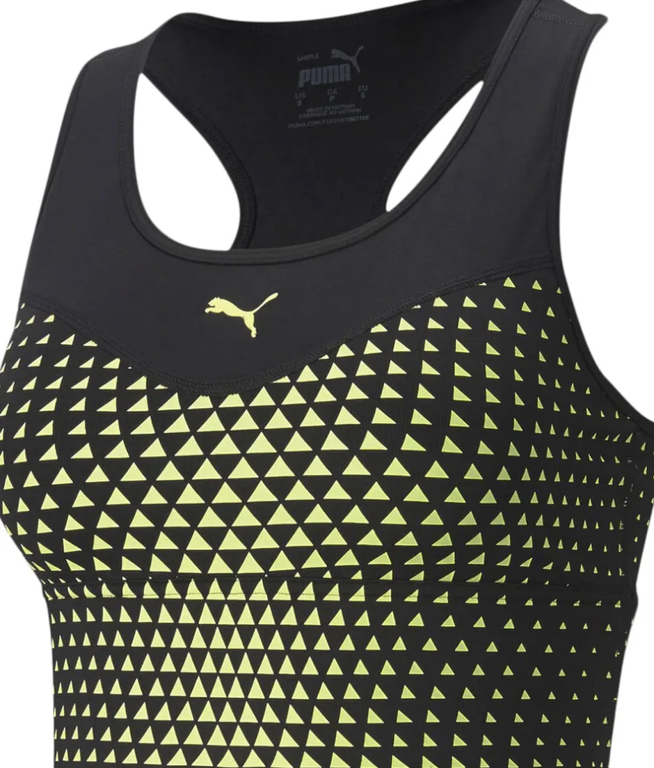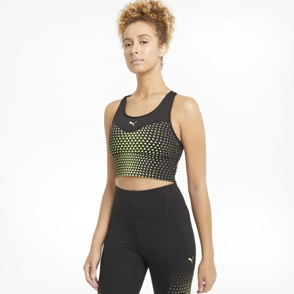 PUMA Medium Impact Graphic Long Line sports-bh til damer giver den rette mængde støtte til forskellige træningsformer. Det lange linje design tilbyder ekstra dækning, og det bløde, åndbare materiale sikrer, at du forbliver komfortabel under hele din træning. Bh’en har PUMA-logo og et grafisk mønster, der tilføjer stil til din træningsgarderobe. Den er ideel til medium intensitetstræning.