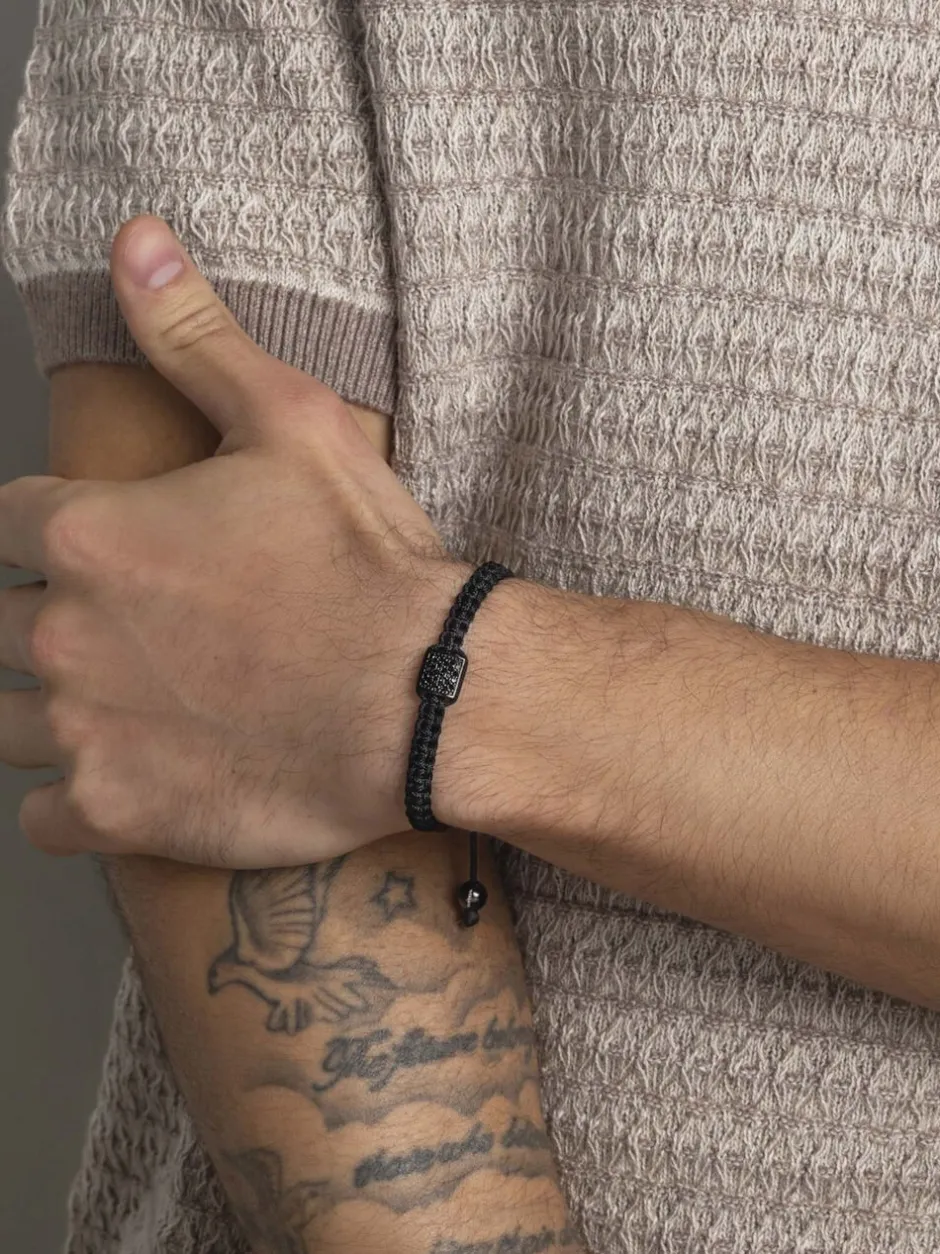 String-armbånd med sort nylonstreng. Lås og perle er lavet af rustfrit stål med sort plade. Black Cubic Zirconia er også inkluderet. Håndlavet i Los Angeles