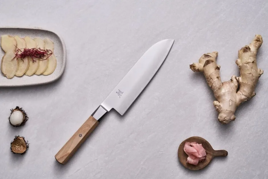 Santoku fra MIYABI 4000FC serien med en bladlængde på hele 180 mm. Santoku er den bedst sælgende knivtype i Japan, hvilket ikke er underligt, da knivtypen er meget alsidig og kan bruges til at skære både fisk, kød og grøntsager.