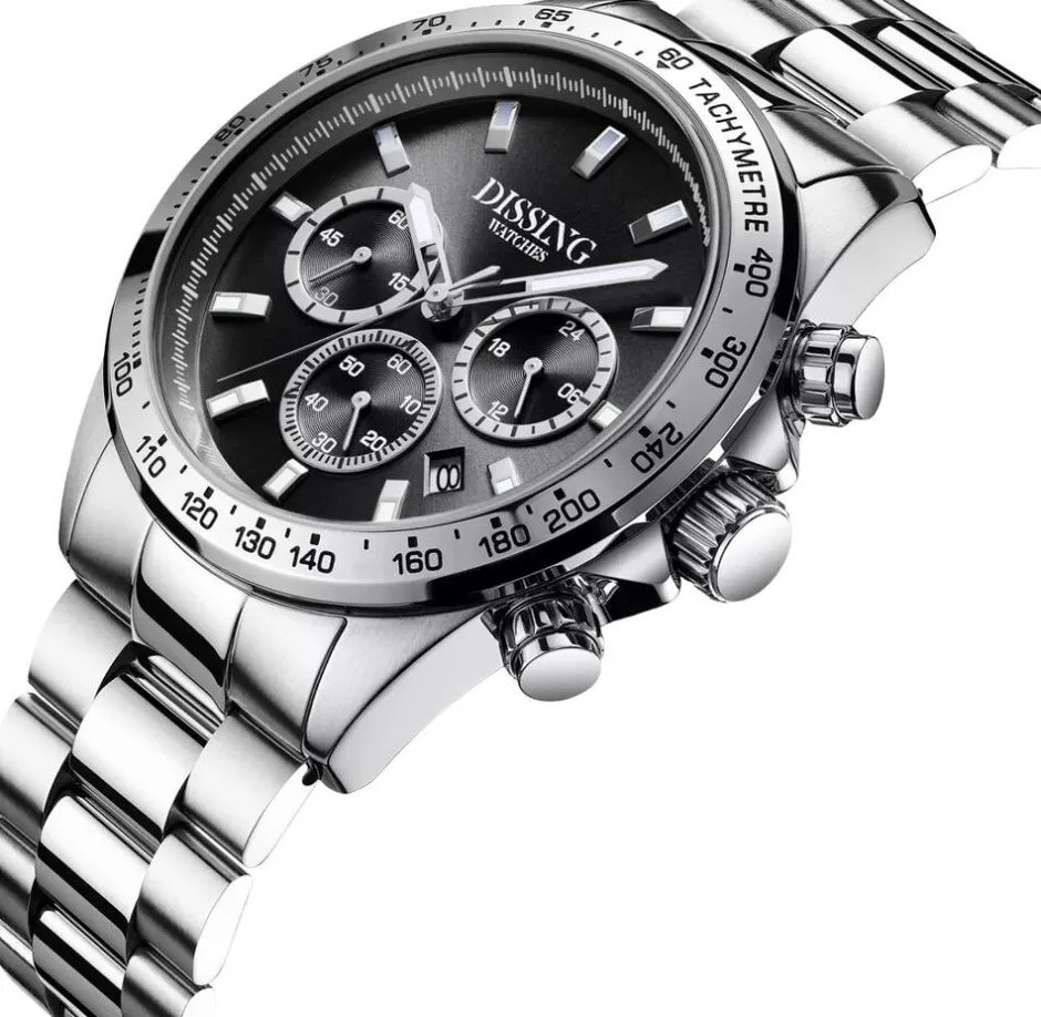 Dissing MK9 D1203 er et imponerende ur, der kombinerer robust funktionalitet med et slankt design. Med en diameter på 43 mm skiller dette ur sig ud på håndleddet. Den runde urkasse er suppleret med en detaljeret bezel med en tachymeter-skala, der tilføjer et dynamisk touch til udseendet. Den sorte urskive er udstyret med tre kronografer, hvilket forstærker dets avancerede look. Sølvfarvede visere og timemarkører giver en klar kontrast, der sikrer let læsbarhed. Uret er udstyret med et kvarts urværk drevet af TMI VD53 kaliber.