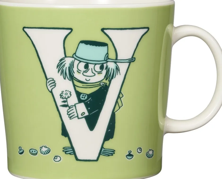 På V-kruset forelsker Fjumredyret sig i Mymlen, men uden held – hun er i stedet interesseret i en excentrisk psykiater, Dr. Hatter. Illustrationen på bagsiden af det større krus er inspireret af tegneserien “”Fjumredyrets frieri””. Mumi by Arabia, 40cl. krus, ABC V