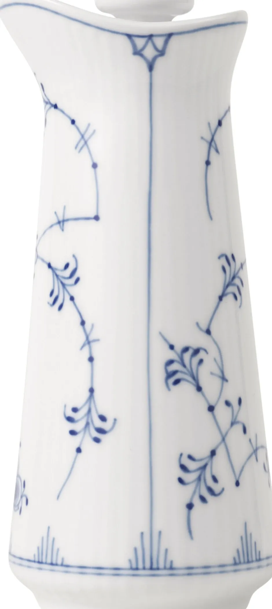 Musselmalet Riflet olie- og eddikeflasken er lige så elegant som den er funktionel. Flasken er designet til at ligge godt i hånden, og mundingen sikrer et drypfrit hæld. Flasken er et perfekt match til Musselmalet Riflet salt- og peberkværnen som et smukt og funktionelt sæt.