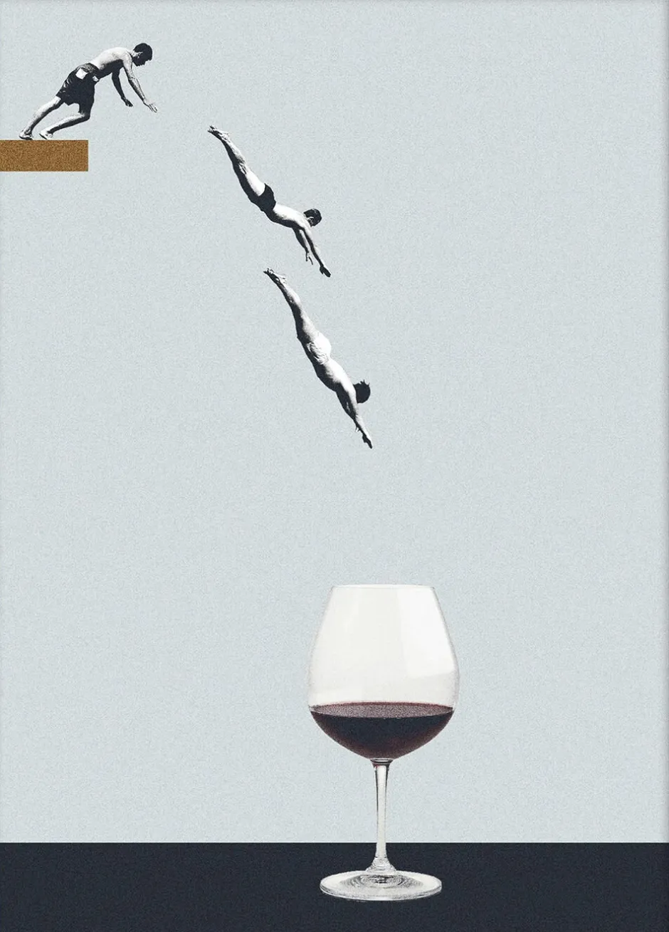 Your Best Friends Forget You Get Old” by Leon Maarten is a captivating portrait poster that depicts three men diving off a diving board into a glass of red wine against a faded blue background. This black and white collage poster combines humor, drinks, sports, and art into one eye-catching piece. *Please note that frames are sold seperately.