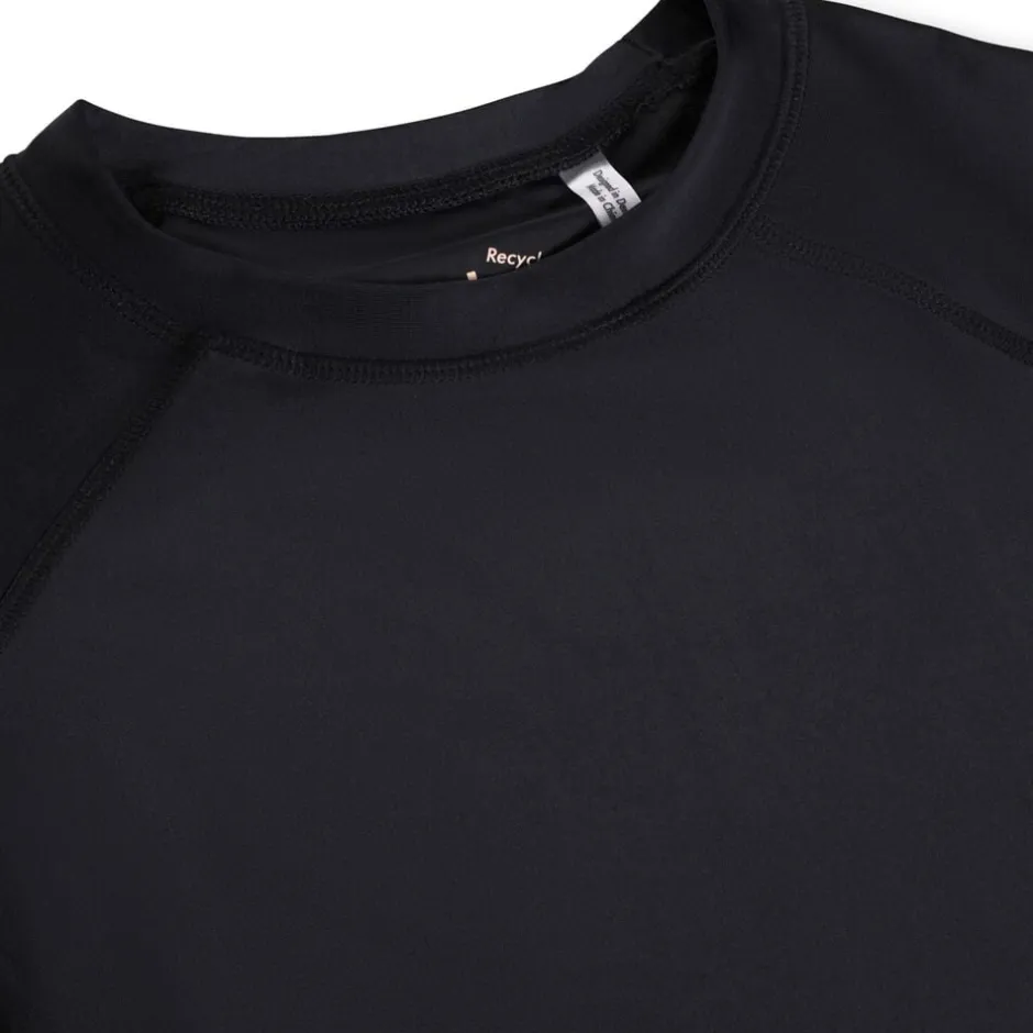 Badet-shirten til børn er designet til aktive legesyge sjæle. Fremstillet af genanvendt polyester, giver den UV50+ beskyttelse mod solens stråler. Den tætsiddende pasform med opretstående krave og korte raglanærmer sikrer, at dit barn kan bevæge sig frit og komfortabelt ved både strand og pool. Materialet er strækbart og let, ideelt til sommerens leg.