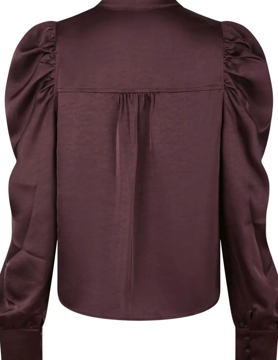Bluse i en fin satin kvalitet. Blusen har v-halsudskæring med en lille krave, lange pufærmer og tætsiddende manchetter med knaplukning. Den har en almindelig pasform. Modellen er iført størrelse 36.