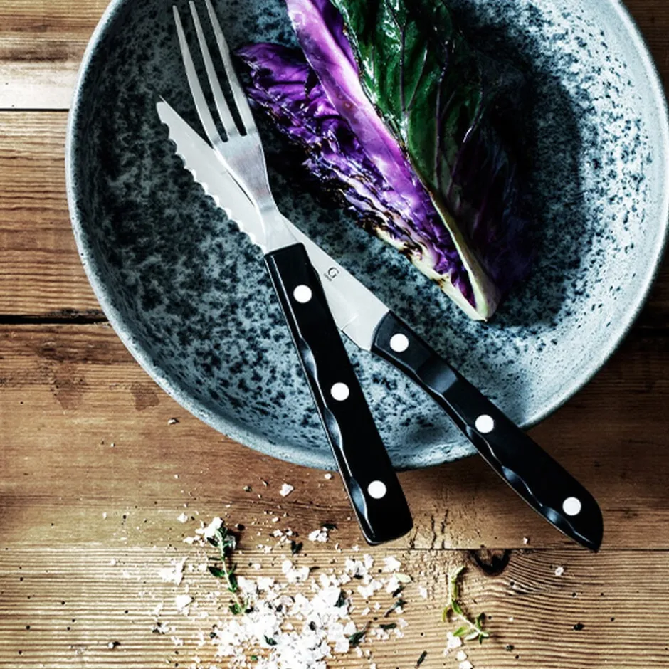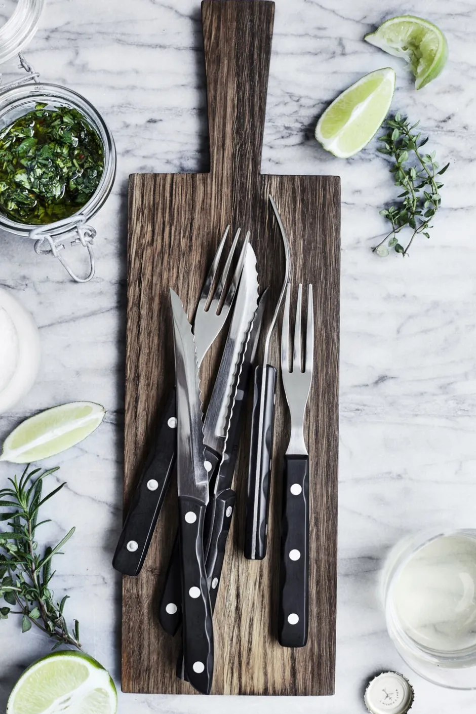 Et meget skarpt og klassisk bestik, i en udsøgt kombination af POM og blankpoleret rustfrit stål. Særligt velegnet til bøffer og andet godt fra grillen. Old Farmer Black 6 grillknive og 6 grillgafler i sort trææske. Maskinopvask anbefales ikke, da skafte og nitter bliver mat i udsendet, men det tager ikke skade.
