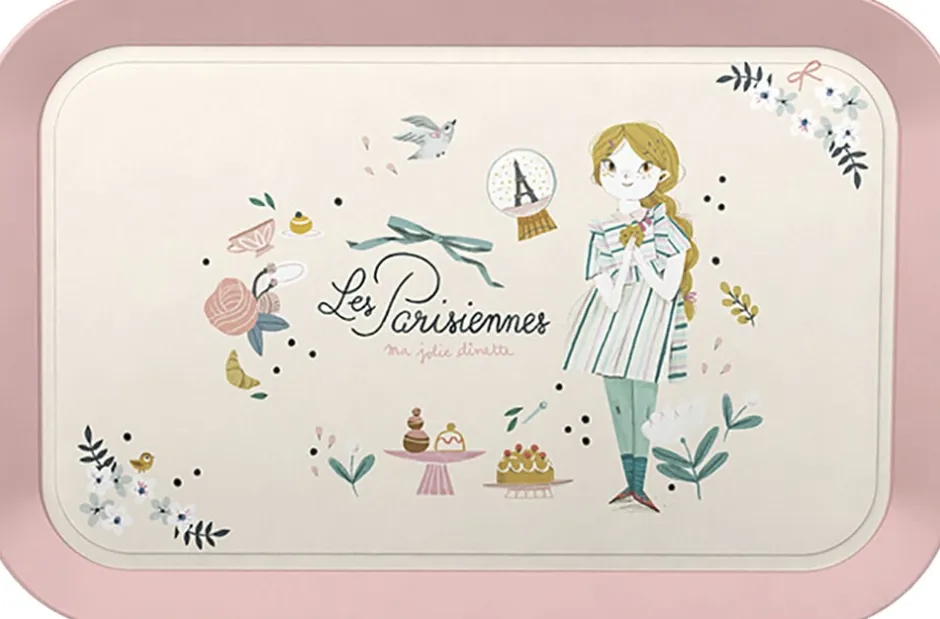 Metal testel i en fin kuffert. Delene er i pastelfarver med blomstermønster og små parisiske illustrationer af Lucille Michieli.