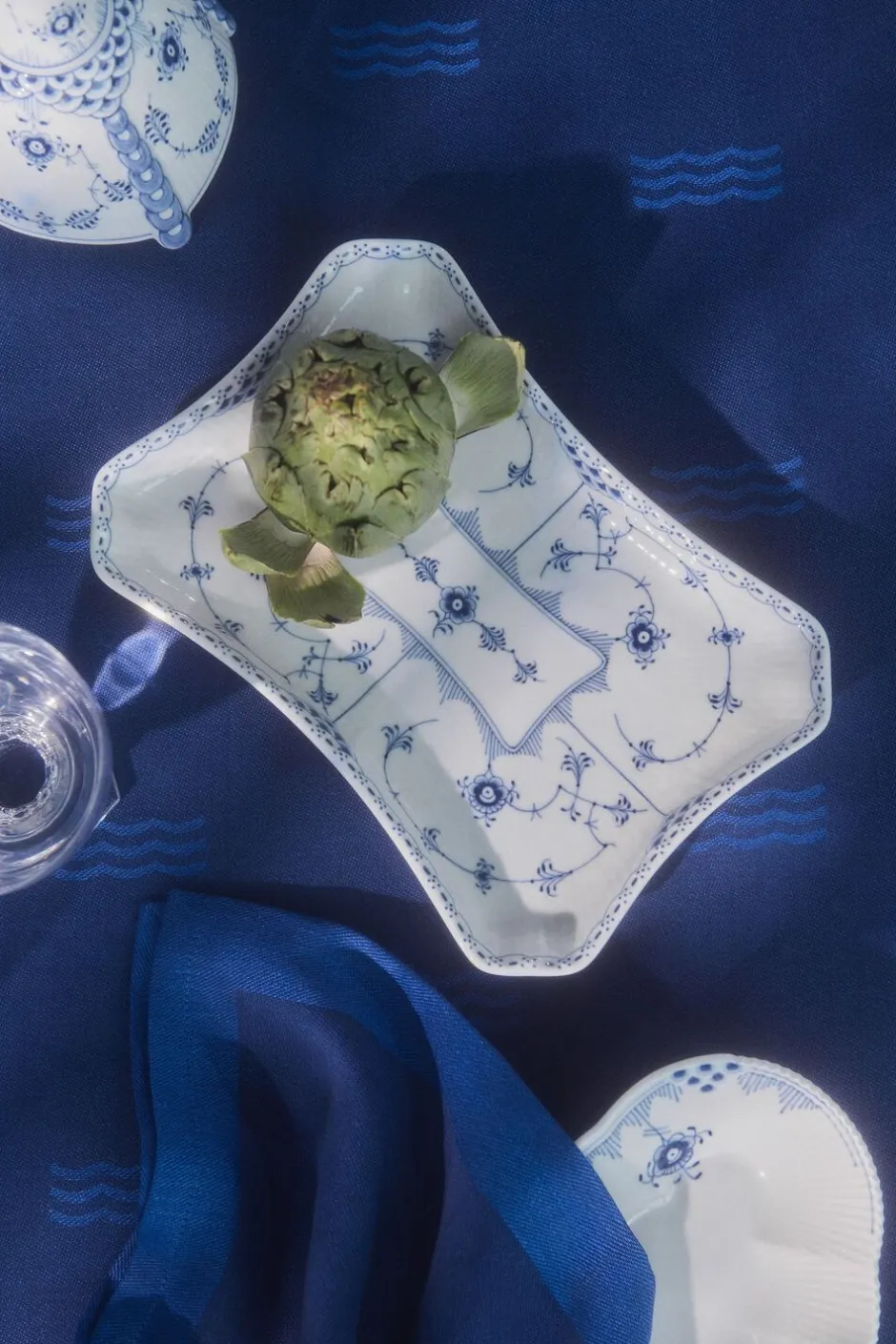 Waves servietten er den perfekte afslutning på en smukt dækket bord. Dette sæt med to servietter er fremstillet i en kraftig jacguardvævet kvalitet i en dyb blå farve og er prydet med et subtilt mønster af Royal Copenhagens tre bølger og krone. Et tidløst design, der udstråler klassisk elegance og øjeblikkeligt løfter din middagsoplevelse.