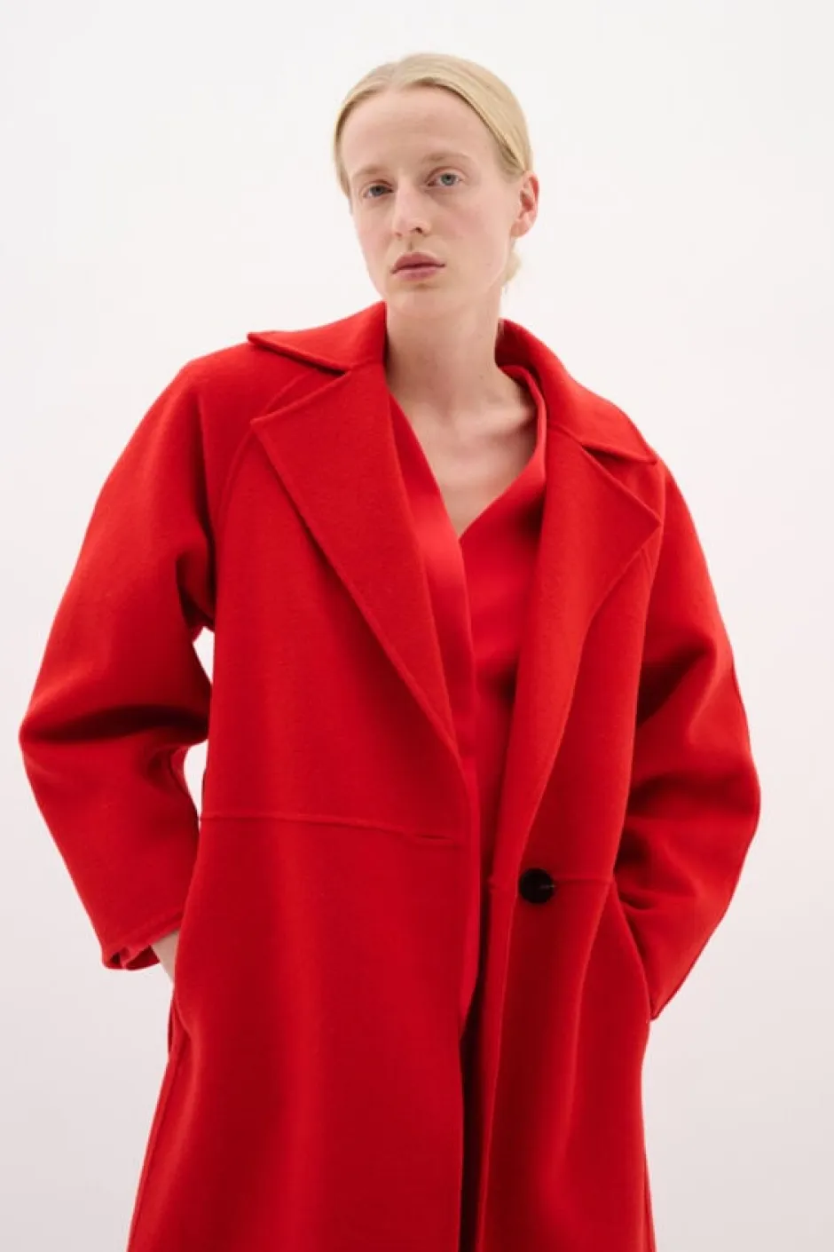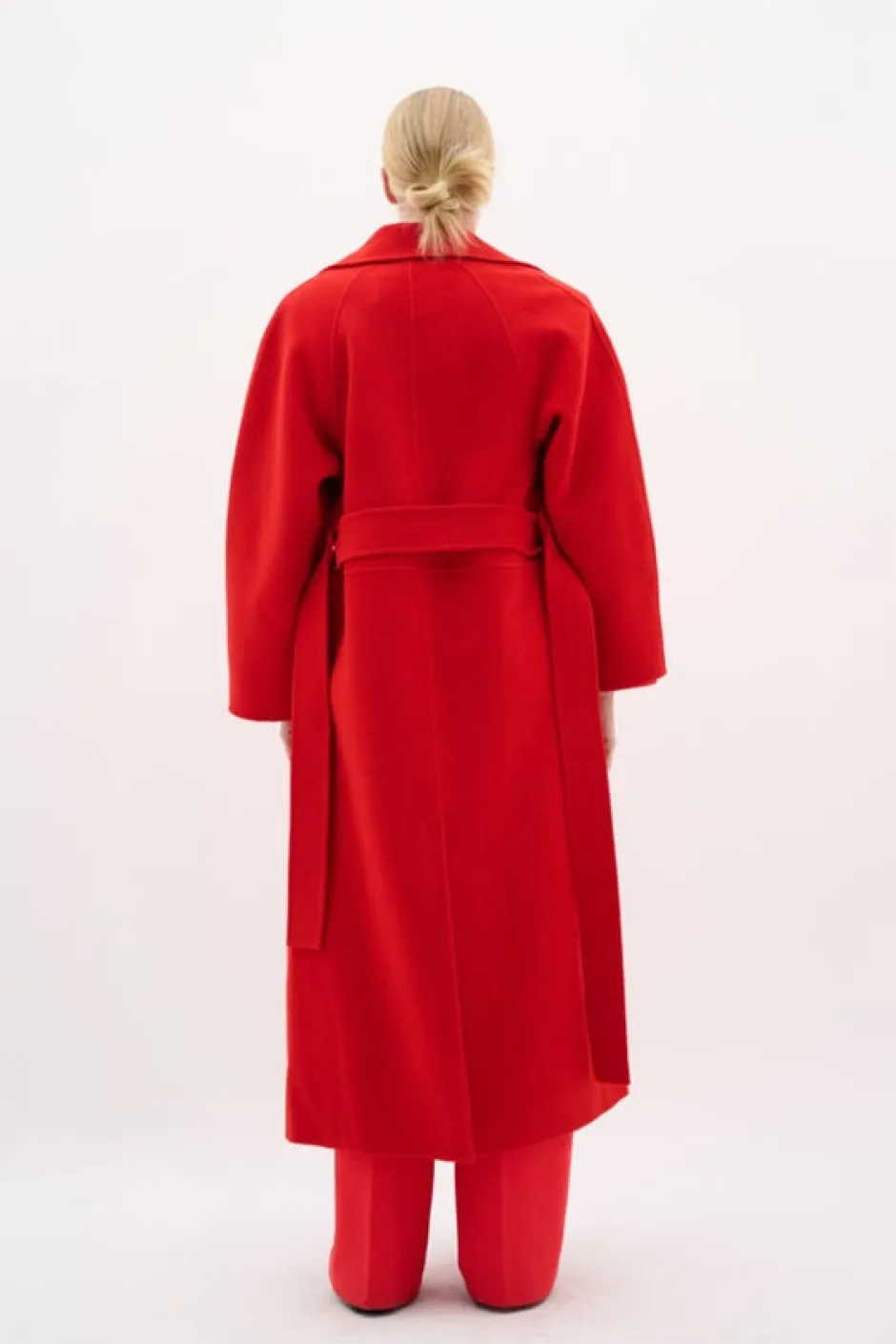 Denne damefrakke i lang, afslappet pasform har et bælte, bredt revers og fuld længde, hvilket gør den ideel til alsidigt og komfortabelt overtøj. Modellen er 177 cm. Høj og er iført en str. S / 36.