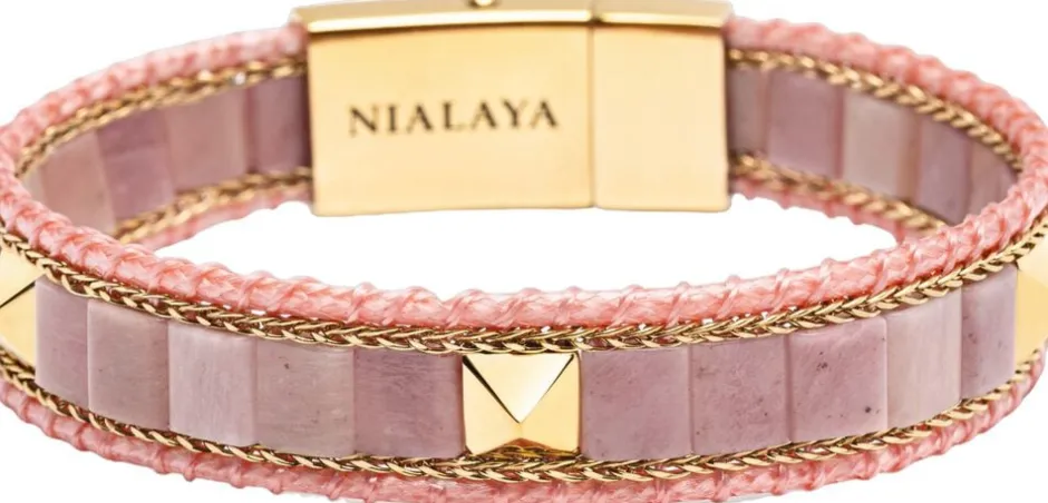 Rhodonite Stud-armbånd til kvinder, 10 mm armbåndsbredde, 6 mm rhodonitperler, poleret 18K000 guldbelagt lås og stropper, vævet snor og kædedetaljer. Håndlavet i Los Angeles