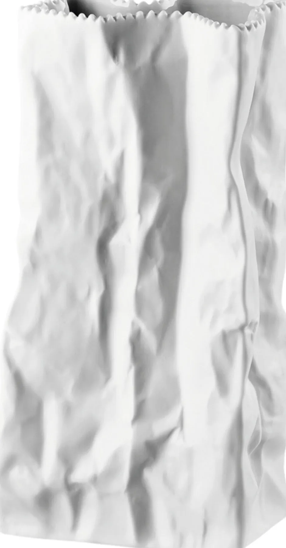 22 cm vase, Do not litter, mat hvid. Posevasen af designeren Tapio Wirkkala forvandler den sammenkrøllede papirpose til et designobjekt. Den finske designers usædvanlige posevase leger med billedet af denne krøllede hverdagsgenstand. Det betyder, at et produkt, der reelt er beregnet til affald, støbes i fint porcelæn og bliver et kultobjekt. Vasens design bevarer knæk, folder og kanter i det bedste porcelæn, hvilket giver genstanden en skulpturel karakter.