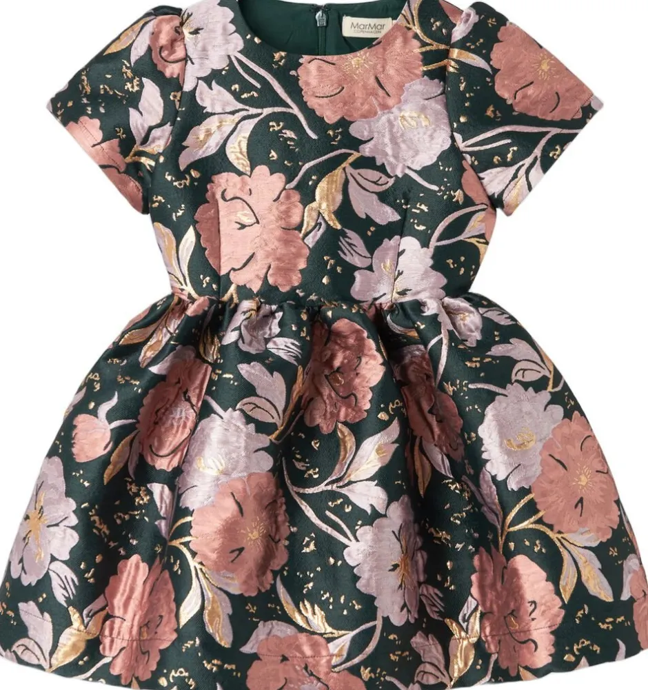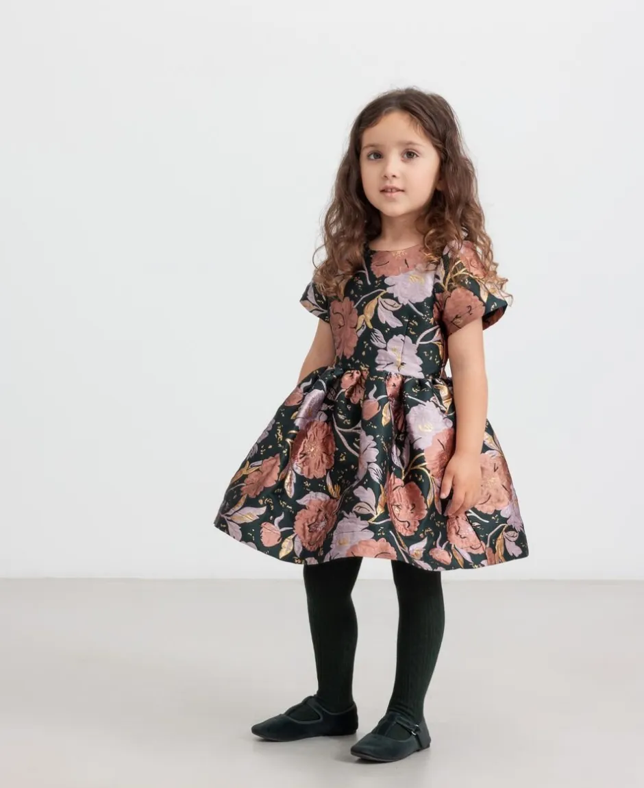 Kortærmet kjole til børn i en eksklusiv jacquard-vævet kvalitet med en elegant tekstur og et delikat blomstermønster. Kjolen lukkes med lynlås bagpå, hvilket tilføjer et klassisk og raffineret touch samtidig med, at den er nem at tage af og på. Perfekt til både festlige lejligheder og særlige øjeblikke. Kjolens længde går til over knæet.