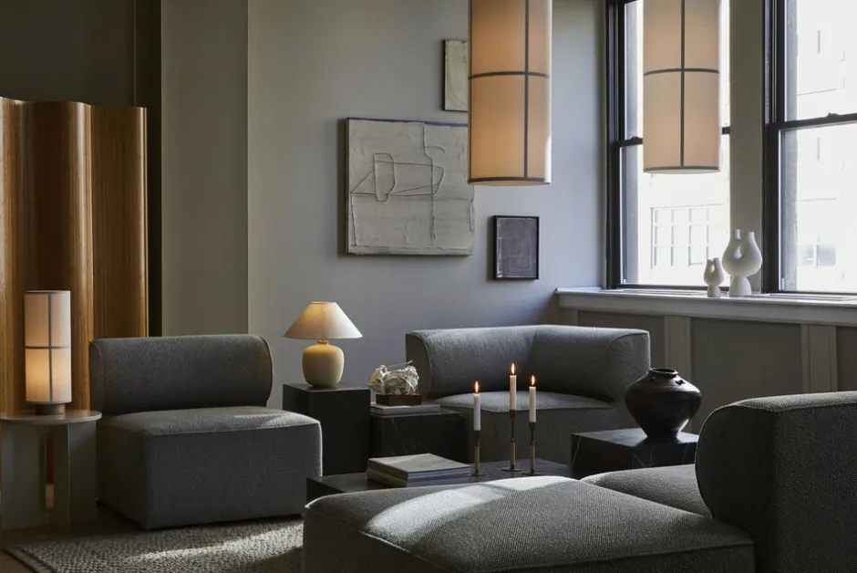 Kollektionernes vedhængslys er skabt med samme søjlelignende form som gulv- og bordlampen, omhyggeligt dækket med gennemsigtigt stof, der afslører den grafiske struktur indeni og ophængt fra loftet af en tekstilsnor. Spredning omgivende lys i et værelse, det gør en målrettet vedhæng over et spisebord, i en reception område eller hotelværelse.