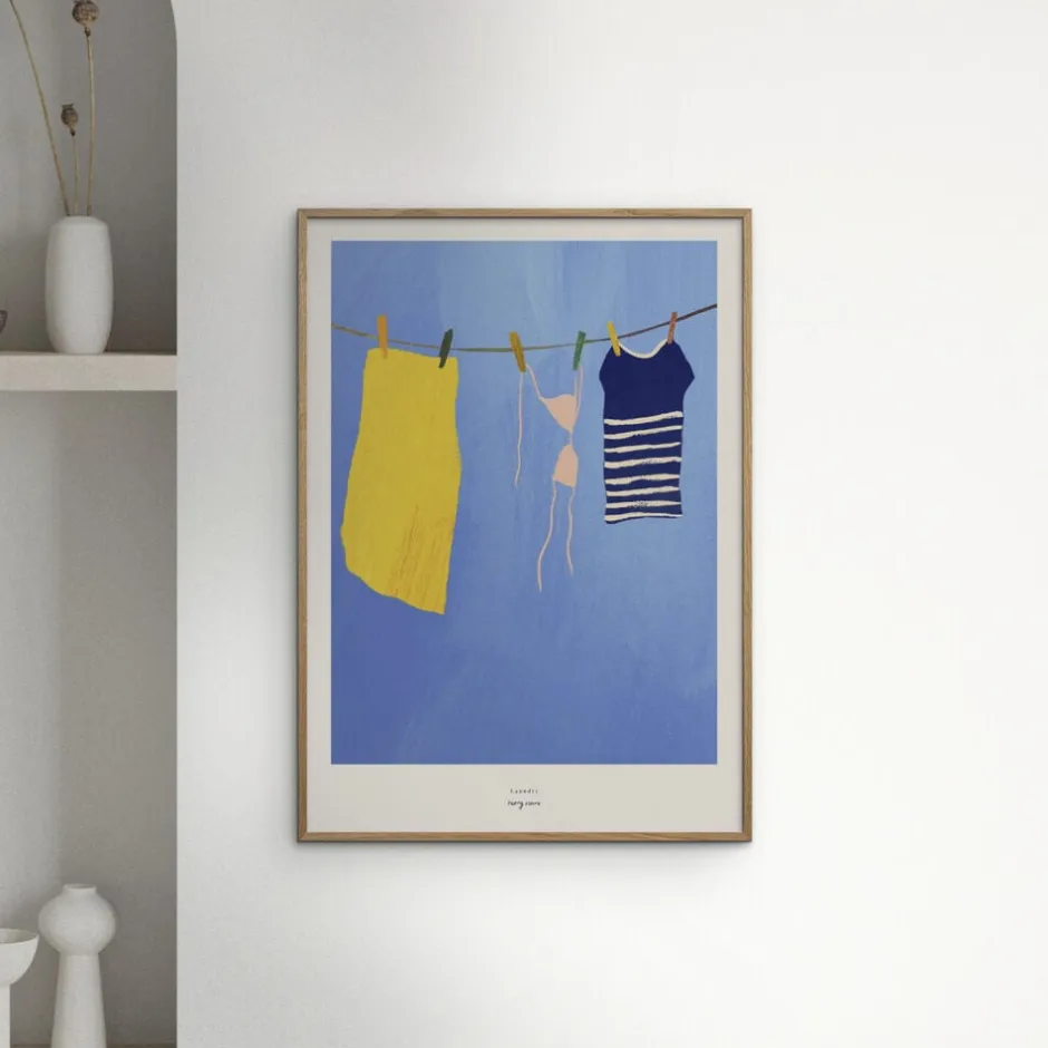 Skab en varm og afslappet sommerstemning i dit hjem med Henry Rivers – Laundry. Denne charmerende plakat fanger et øjeblik af hverdagsro med en minimalistisk skildring af farverige badetøjsstykker og et hndklæde hængende til tørre under en klar, bl himmel. Perfekt til at bringe en følelse af ferie og nostalgi ind i din boligindretning.