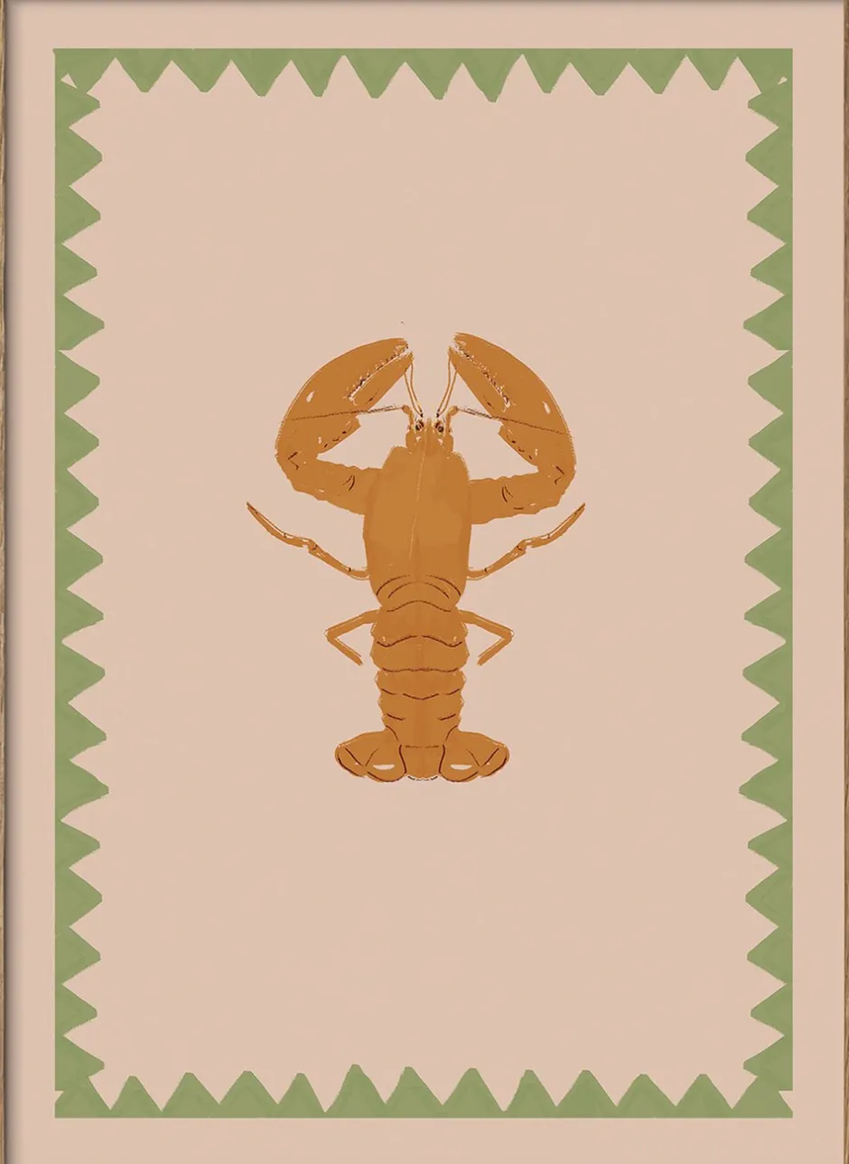 Giv dit hjem et strejf af kystnære charme med denne livlige hummerplakat. Med en dristig orange hummer mod en blød ferskenbaggrund indrammet med en zigzag grøn kant, tilføjer dette kunstværk en legende og nautisk stemning til ethvert rum. Perfekt til fiske- og skaldyrselskere og strand-tema indretning. *Stel sælges separat.