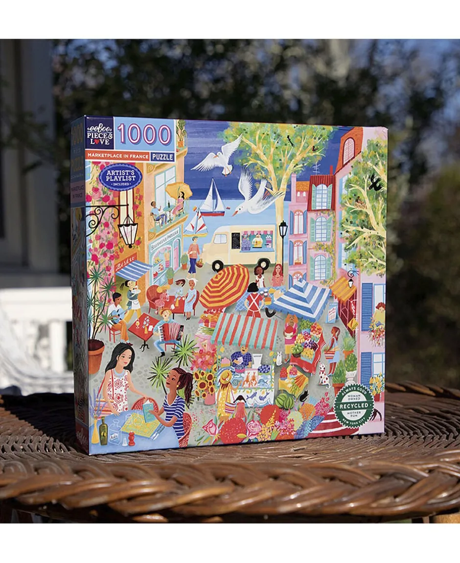 Et lokalt marked i en kystby et sted i Frankrig, travlt med farver, musik og aktiviteter.