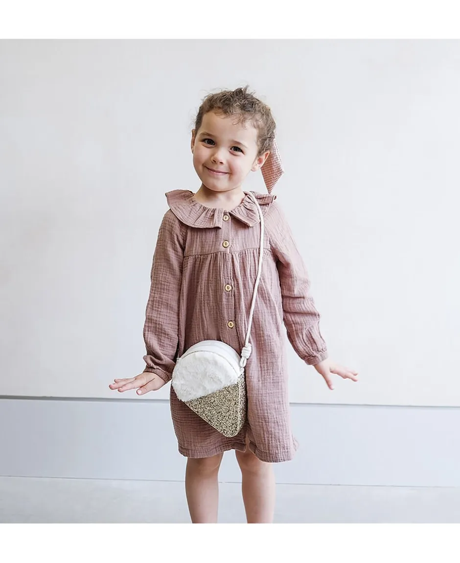 Skuldertaske med form som en vaffelis med hvidt plys og masser af guldglimmer.1 rum og lynlås. Stroplængde 48 cm.
