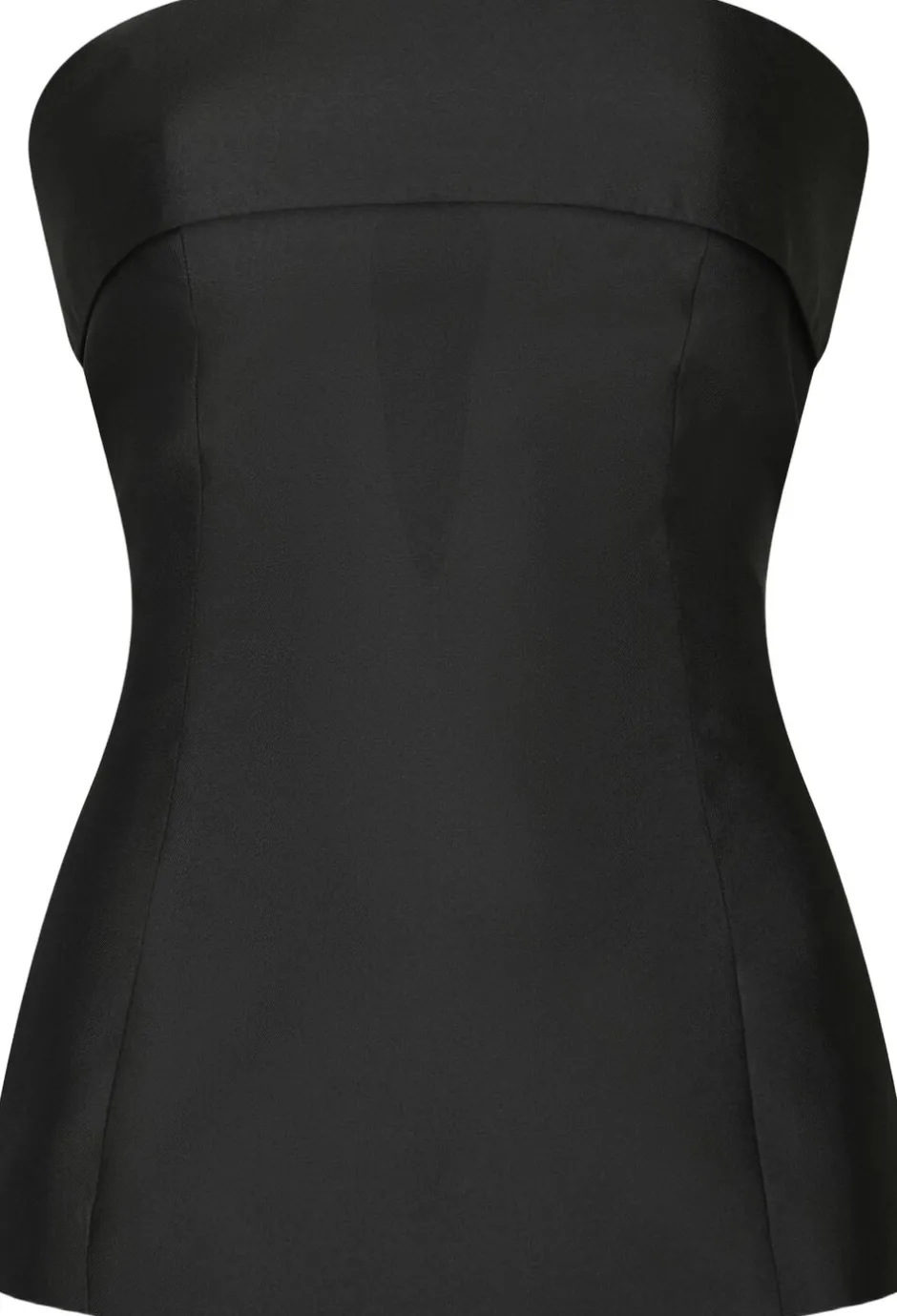 Stropløs top i satin. Toppen har slids i begge side, et opsmøg øverst og lukkes med en skjult lynlås i ryggen. Den har en tætsiddende pasform. Modellen er iført størrelse 36.