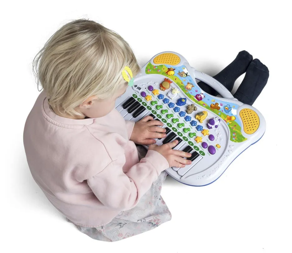 Dyrekeyboard Med 24 tangenter og masser af funktioner, bla indlagte melodier, dyrelyde. forskellige rytmer, lydeffekter, optagefunktion mm Er inkl 3 stk AA-batterier