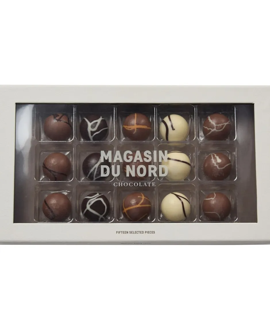 Fyldte chokolader fra Magasin du Nord Chocolate med 5 forskellige smagsvarianter i en dekorativ æske med 15 chokolader. Chokoladerne er produceret i Danmark og er lavet af udsøgte råvarer. Forkæl dig selv eller en du har kær med denne smukke gaveæske.