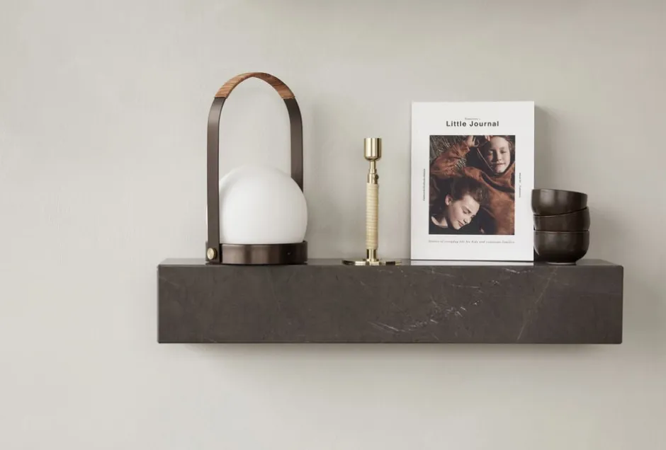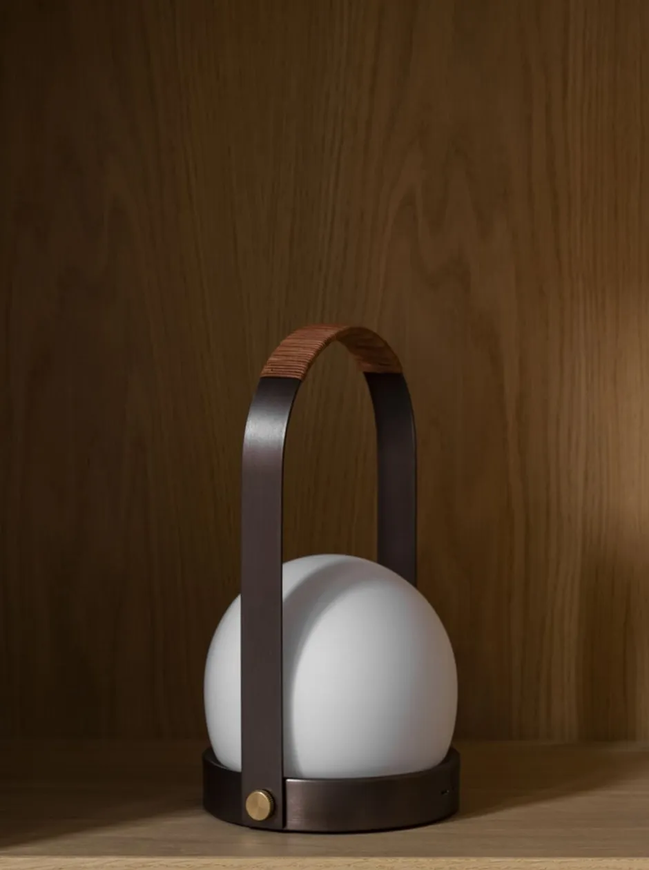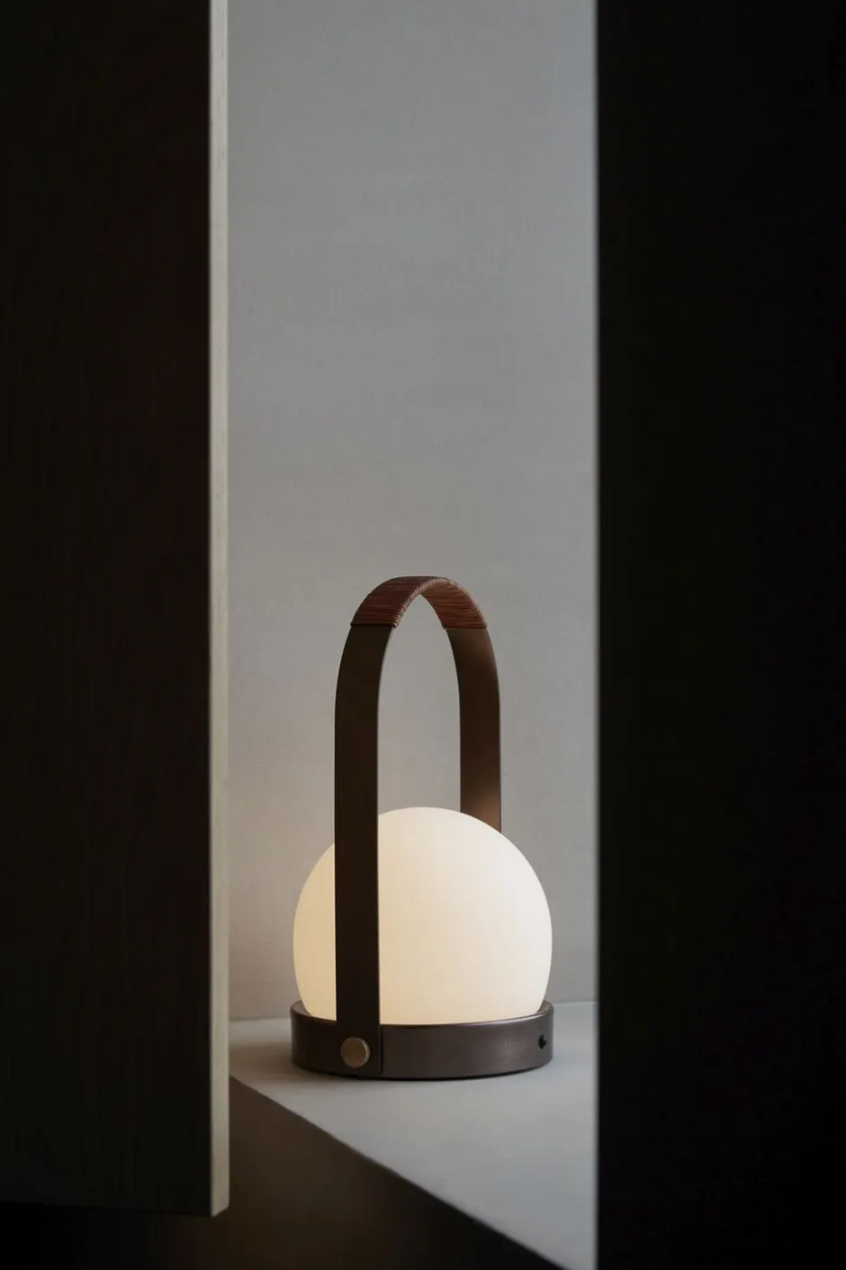 Carrie Table Lamp, Portable, IP44 er designet som en bærbar, letvægtslampe og er unik for dens mange anvendelser og foranderlighed. Med et slankt, funktionelt håndtag og en varm lyskugle, der forsigtigt ligger i en kurvlignende base, er lampen anvendelig næsten overalt, selv på farten, da den er ledningsfri og kommer med USB-oplader. Flyt den fra dit kontor til dit natbord, til din aftenpicnic i parken og i din cykelkurv, mens du kører hjem. Den bærbare LED-lampe kommer i sort, hvid, brændt rød, olivengrøn, børstet messing og bronzeret messing med læder. Den tilbyder et varmt lys i tre indstillinger, perfekt til at skabe en hyggelig atmosfære. Fuldt opladet vil den forblive tændt i ti timer. Vigtig brugsinformation: For at holde det interne batteri sundt, lad kun Carrie være tilsluttet under opladning med lampen slukket. Lad ikke stikket være tilsluttet, mens det er i brug. USB-kabel og adapter Intern LED-lyskilde vurderet til 25. 000 timer Lyskilde: 384 Lumen, 2700K, CRI80+ (kan ikke udskiftes) Dæmpbar, 4-trins (0%, 10%, 50%, 100%) 3,7V 5000mAh internt genopladeligt lithiumbatteri (10-timers kapacitet) Aftageligt håndtag Ladekabel medfølger (USB til Micro-USB) Strømstikadapter inkluderet (USB til to-bladet US-stik)