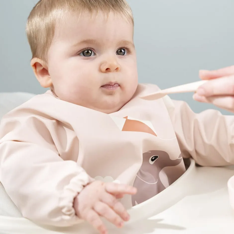 Fin, blå hagesmæk med motiv af Elphee, der flyver med drage