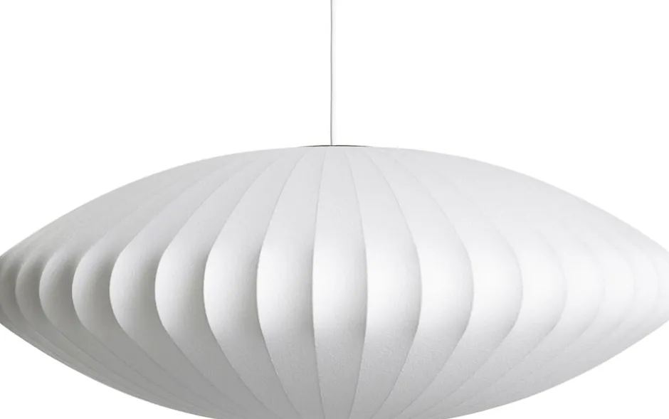 The Nelson Saucer Bubble Pendant’ har en stor overflade og giver et blødt lys – uanset rummet. Lampen leveres med en stålplade, som kan bruges som loftplade. George Nelson, designer og idemand, blev oprindeligt inspireret af svenske silkelamper, da han i 1952 designede ‘the Bubble Lamp series’.